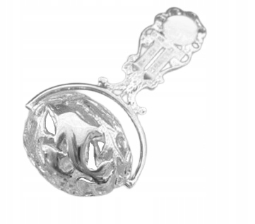 Погремушка в виде серебряный шарик, ручка украшена ажурным ажурным узором.