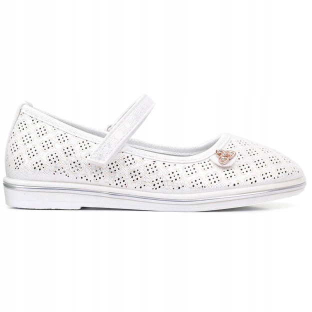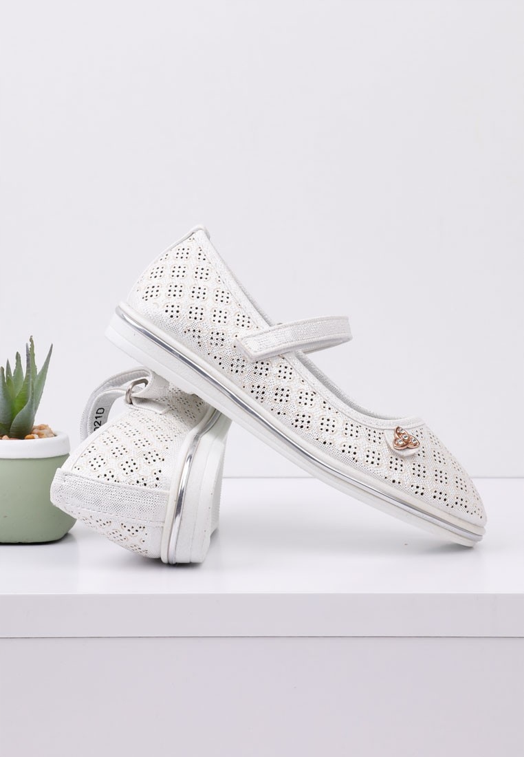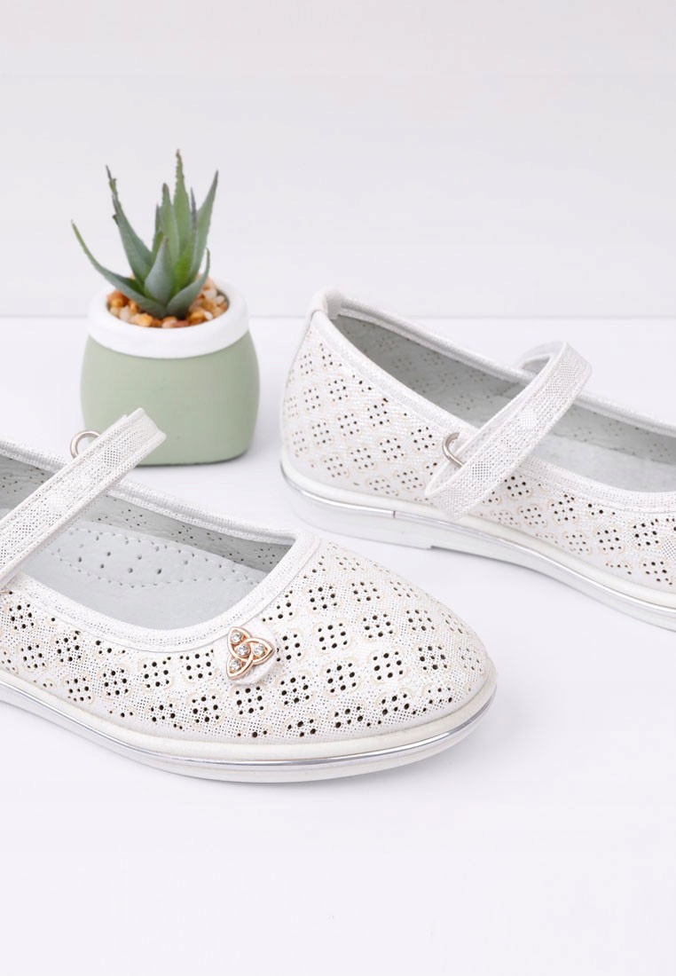 Балерины для девочек на плоской подошве. Ажурный верх из экокожи. Носок круглый, фиксируется узким ремешком вокруг щиколотки. Сбоку имеется небольшая цветочная аппликация.