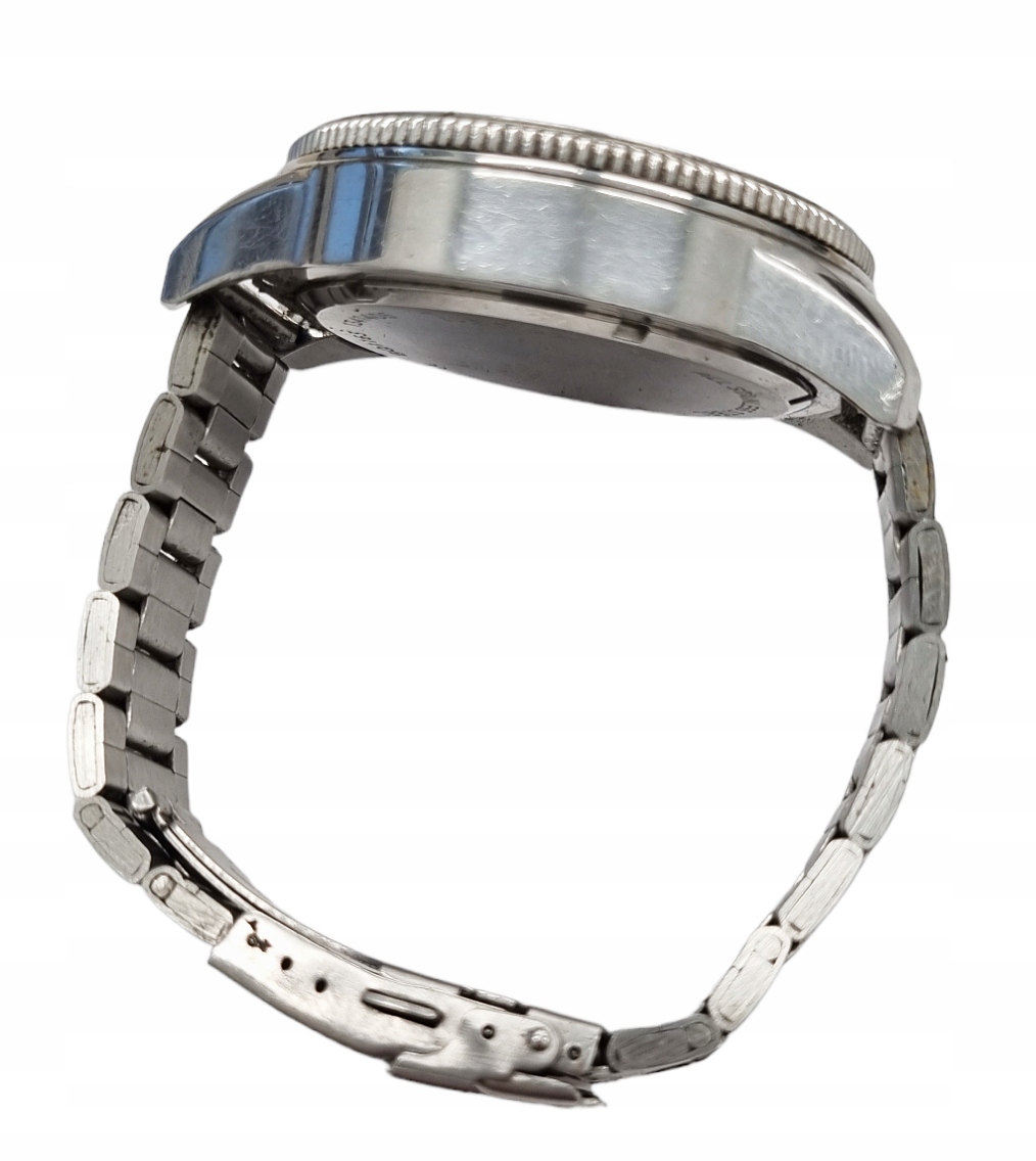 Состояние: удовлетворительное. Стекло имеет небольшой дефект в верхней части рядом с цифрой "12" и 2 царапины на стекле. Имеются царапины на браслете и рамке циферблата.