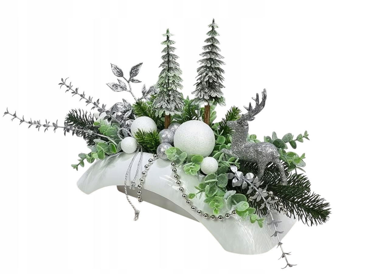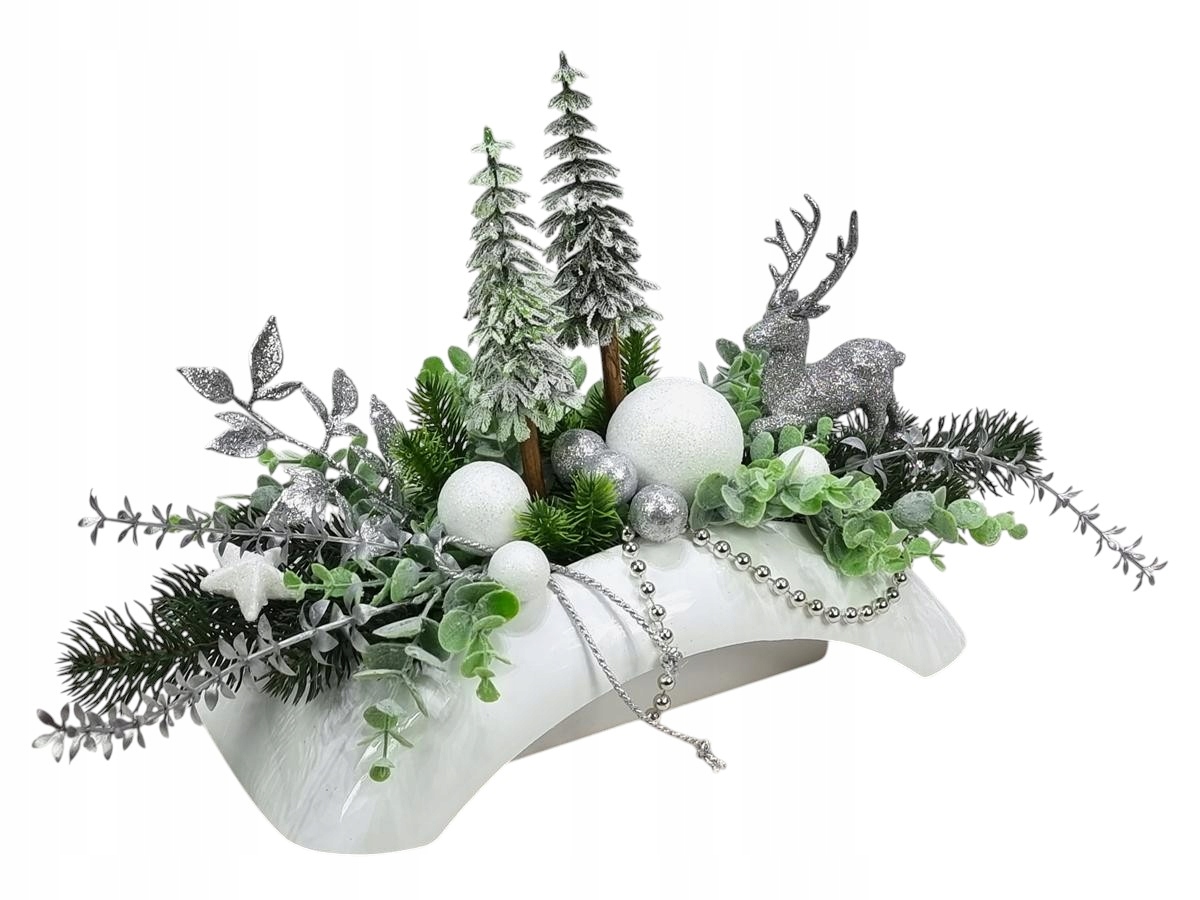 Одно из наших самых популярных и любимых новогодних украшений для кладбища уже несколько лет. В этом году мы предлагаем оленей в различных цветовых сочетаниях. Вот рождественское украшение с елками, безделушками и серебряным оленем. Композиция в прочной белой икебане. Все выглядит великолепно.