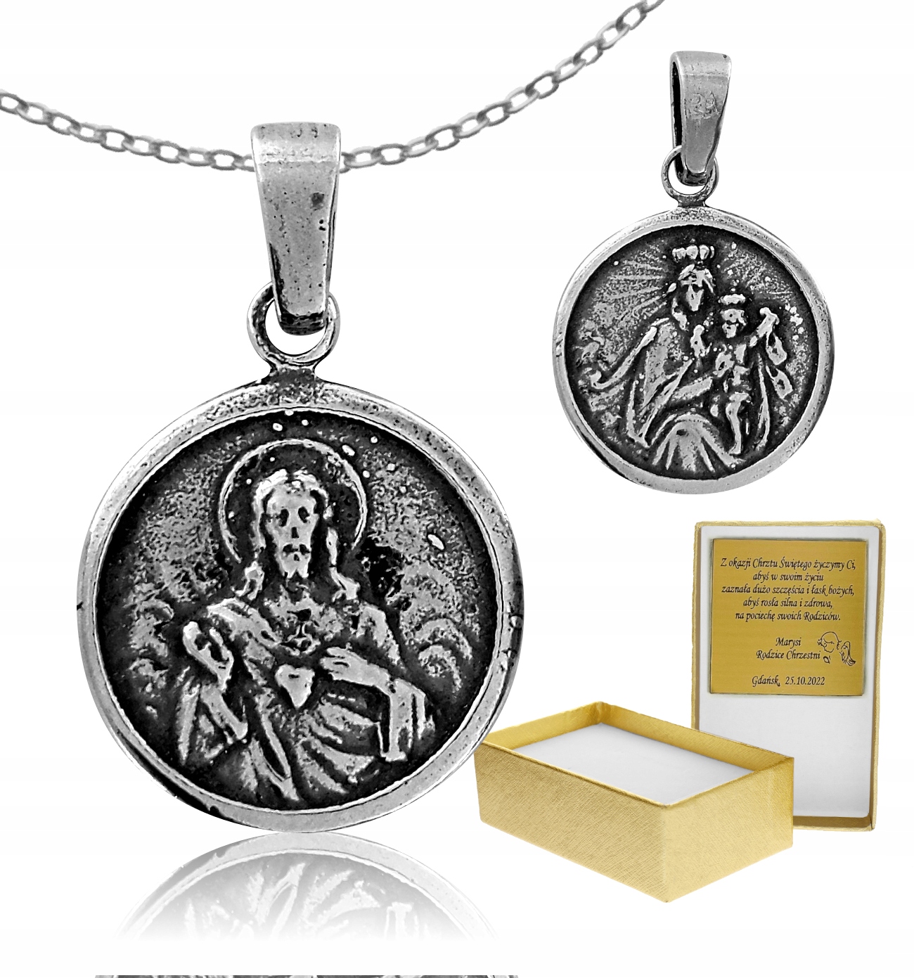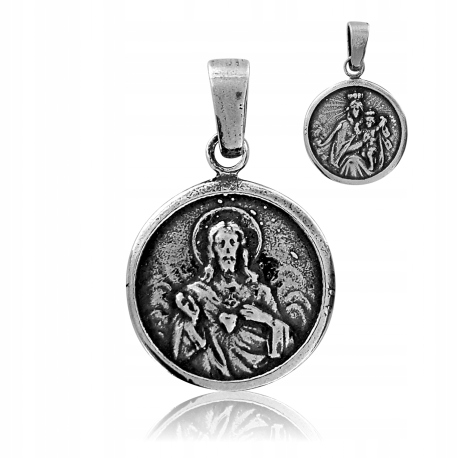 Наплечник - медальон с изображением СЕРДЦА ИИСУСА на одной стороне и БОЖИЕЙ МАТЕРИ С МЛАДЕНКОМ на другой. Выполнен полностью из серебра 925 пробы. >Окисление (тонировка).
