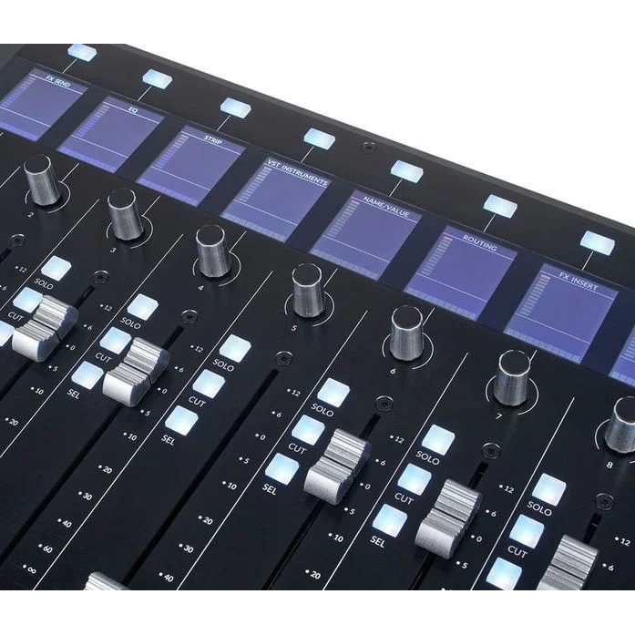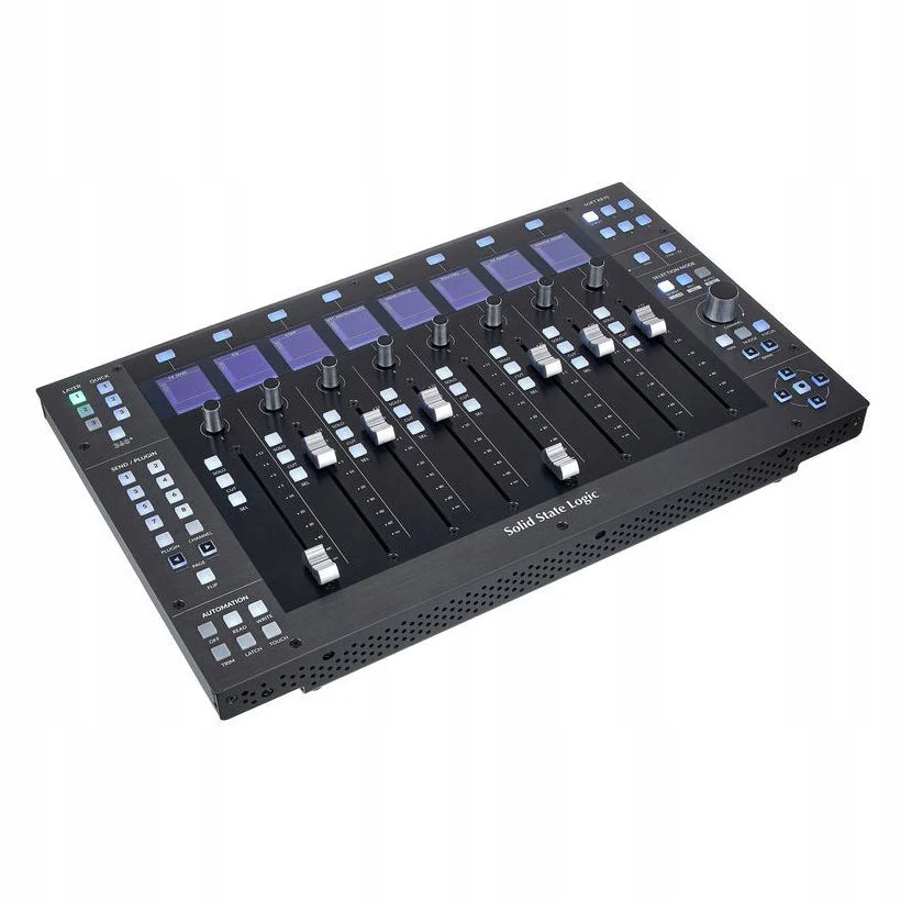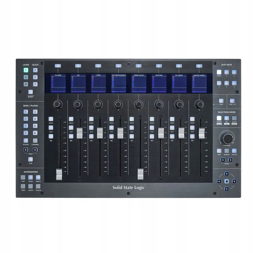 SSL UF8 — это драйвер DAW, с помощью которого вы можете управлять до 8 каналами одновременно. Он имеет 8 моторизованных ползунков, 8 сенсорных элементов управления и 8 цветных TFT ЖК-экранов высокого разрешения для визуального контроля. Для упрощения навигации UF8 предлагает универсальный главный диск, который можно использовать для навигации внутри сеанса, выбора дорожек или имитации колеса мыши. Вы можете назначить 40 свободно назначаемых клавиш для отдельных сочетаний клавиш (отсортированных на 5 банков по 8 клавиш в каждом), дополненных 3 «быстрыми» клавишами. Это позволяет легко адаптировать драйвер к любой DAW и любому рабочему процессу.