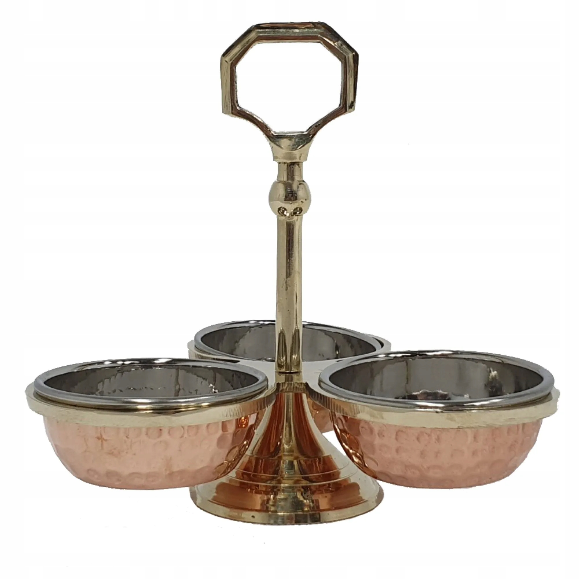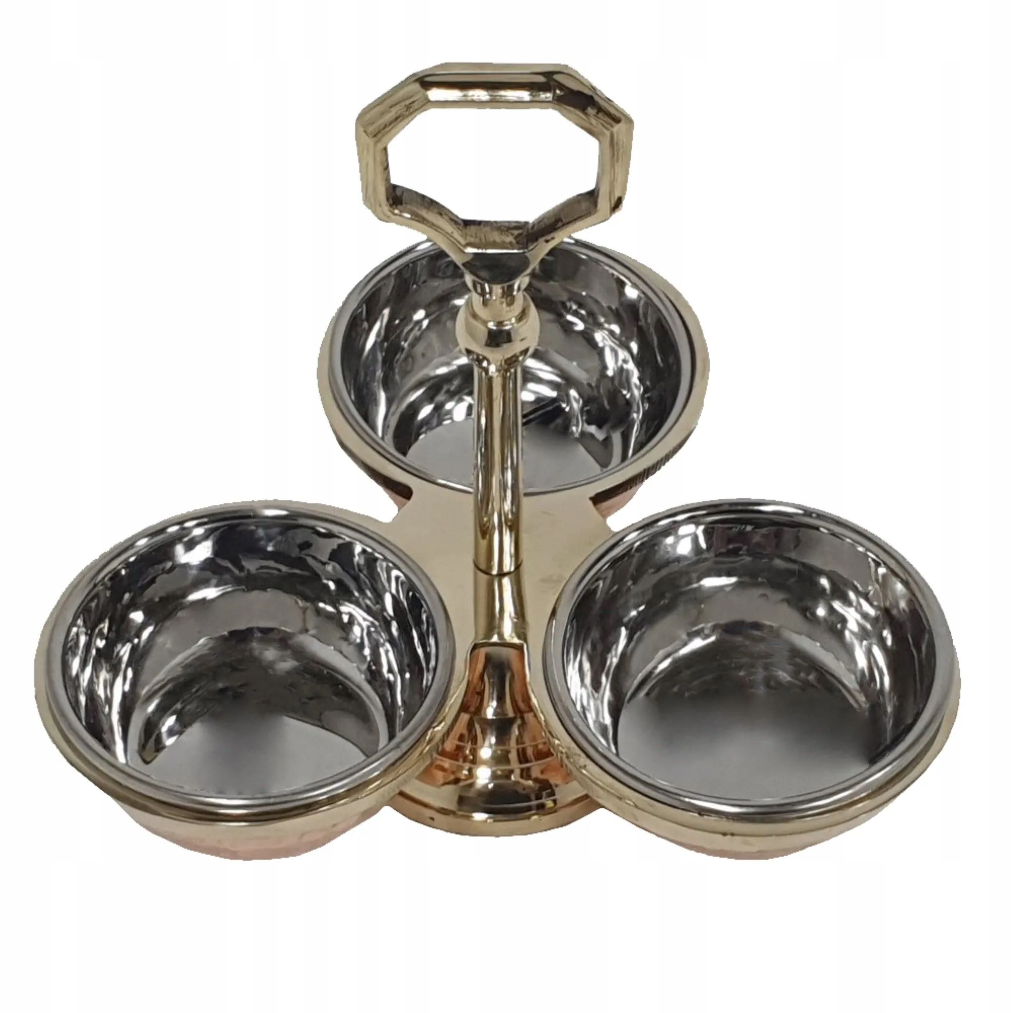 Стальная и кованая медная «папоротник» - это уникальное произведение искусства ручной работы, идеально подходящее для подачи закусок и соусов в стиле индийской кухни. Эта элегантная тарелка с контейнером соуса сочетает в себе функциональность с необычайной эстетикой. Поверхность нержавеющей стали не только сохраняет вкусовые и питательные значения блюд, но также безопасны в контакте с едой и простым в чистке. Внешний листовой металл от кованой меди с двумя латуниными ручками добавляет изделия из продукта изысканный вид, что делает его не только практическим кухонным инструментом, но и украшением стола. Сделанная талантливыми индийскими художниками, эта тарелка легко чистить и поддерживать, что обеспечивает его долгосрочное использование. Предлагая емкость 3 х 100 мл, это отличный выбор для тех, кто ценит уникальные кухонные аксессуары с более высоким стандартом.