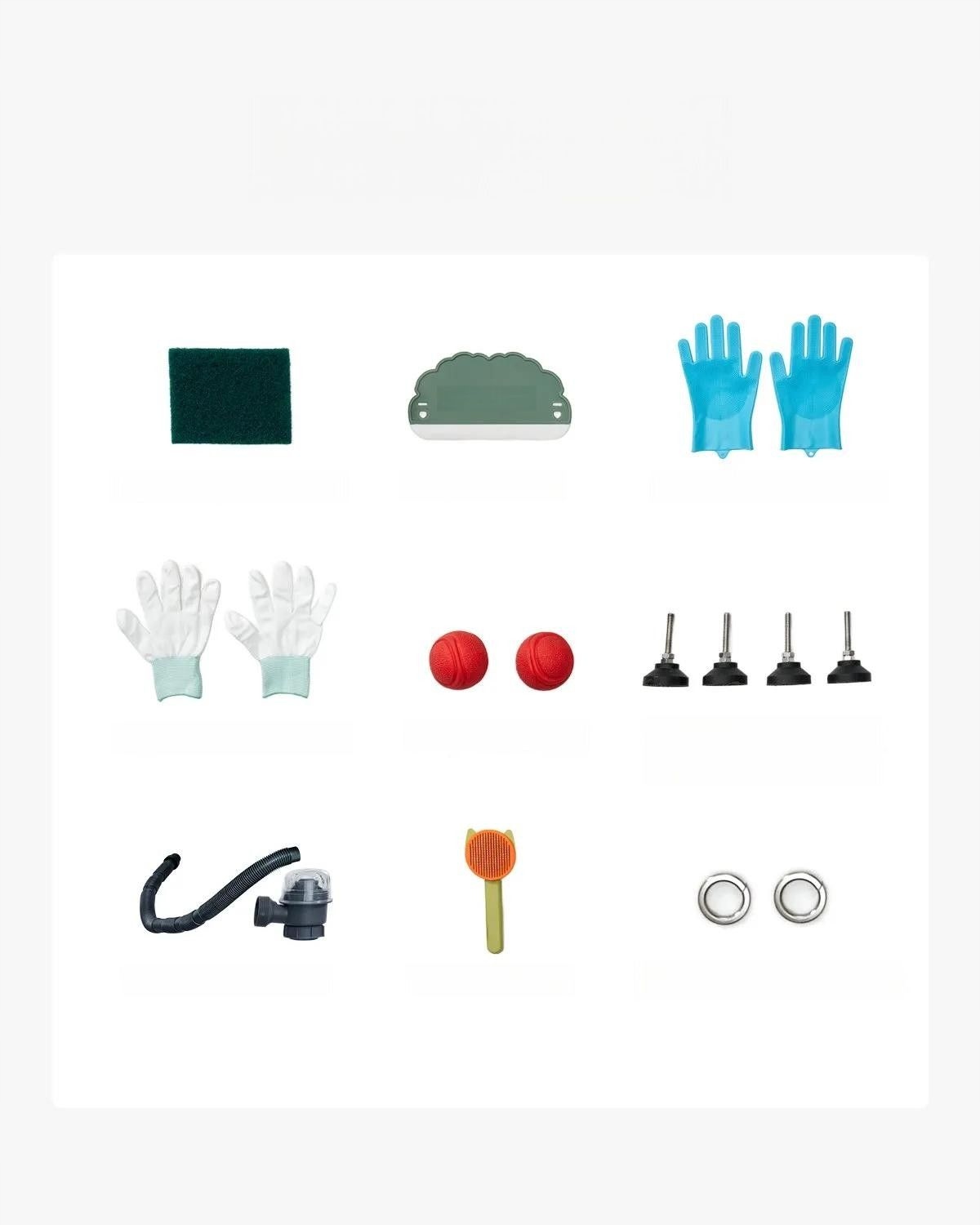 В комплект входят чистящая губка, коврик, пластиковые и нейлоновые перчатки, игровые мячи и подушечки с регулируемым углом наклона. Это все, что вам нужно, чтобы купание и игра доставляли удовольствие.