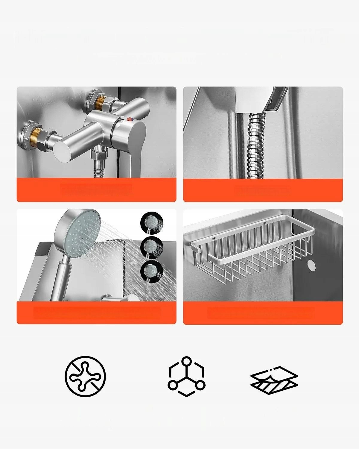 Станция высотой 86,4 см, разработанная с учетом функциональности, с регулируемыми ножками для устойчивости. Подставка для мыла из алюминиевого сплава облегчает использование аксессуаров во время купания.
