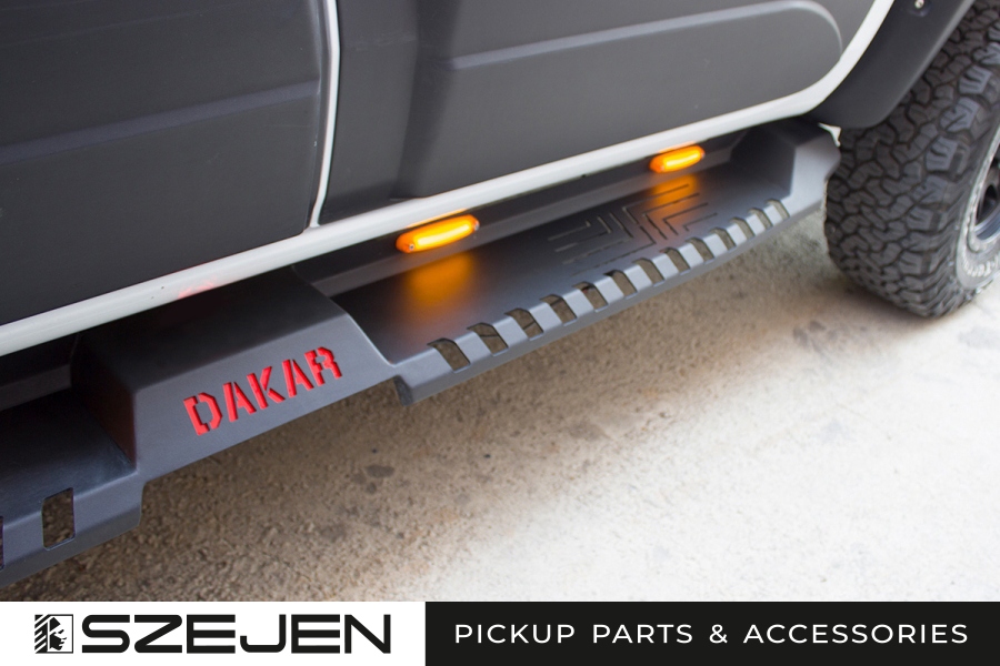 Фотографии предназначены только для иллюстрации. Видимое габаритное освещение (оранжевые фонари) и светящийся логотип «ДАКАР» в комплект не входят. Пороги ДАКАР позволяют установить такие фонари или другие по вашему усмотрению.