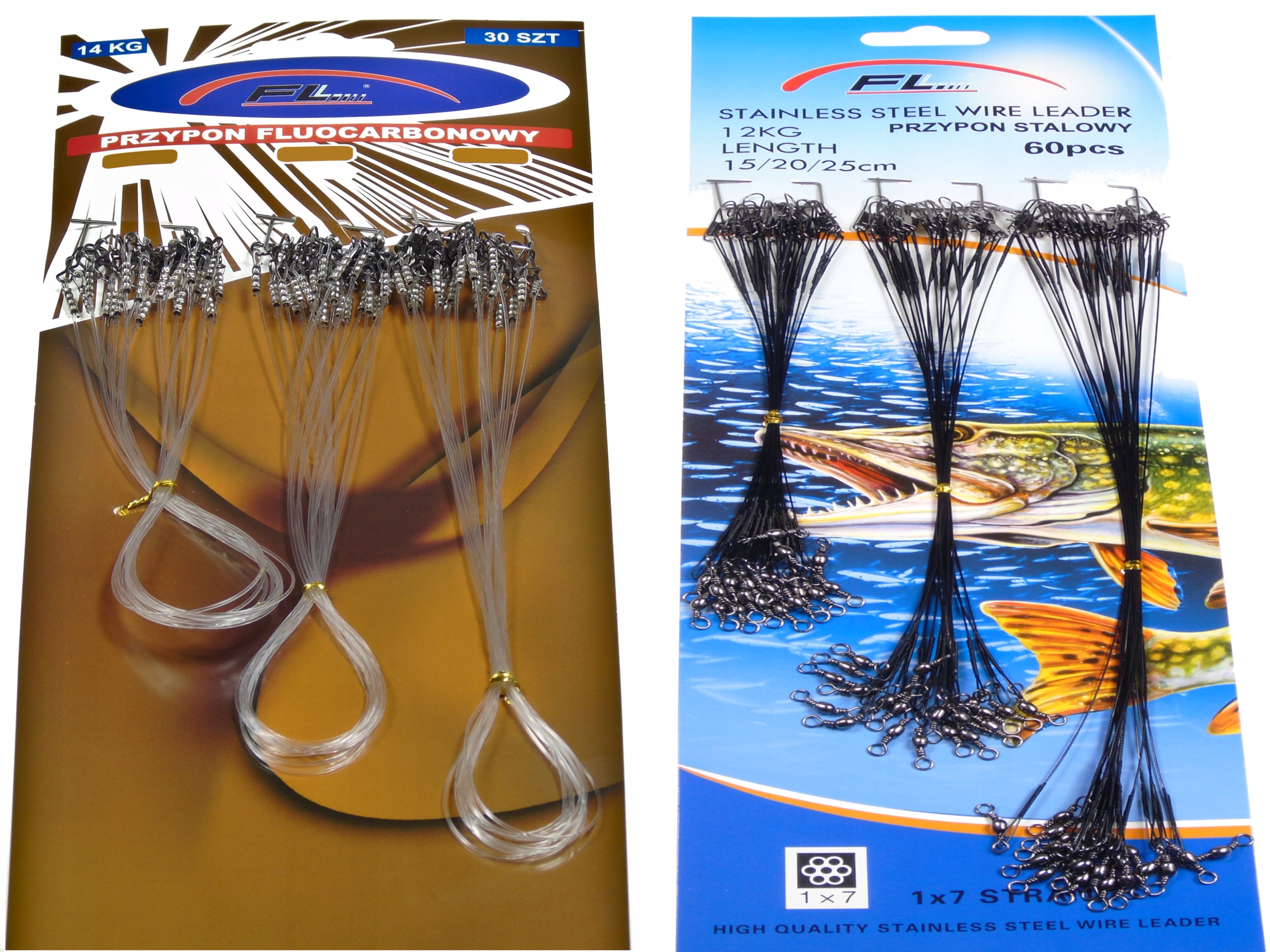 Набор флюокарбоновых поводков. Количество 30 шт. Длина – 15, 20 см, 25 см, прочность – 14 кг. То есть по 10 штук каждого типа. I Набор поводков стальных в черном покрытии, количество 60 шт., длина 15 см, 20 см, 25 см, прочность - 12 кг. То есть по 20 штук каждого типа.