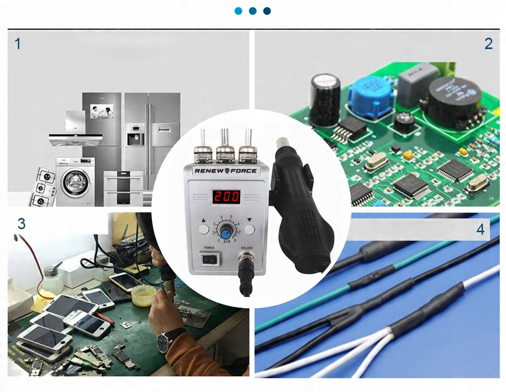 Станция Лутоанея с паяльником горячих воздуха позволяет выполнять ряд работ. горячий паяльный железо -это современная альтернатива традиционным приповным . Благодаря использованию потока горячего воздуха вместо кончика кончика можно припаять даже очень небольшие компоненты электронных систем в точно обозначенных местах. Припаяя железа также является незаменимым при демонтаже элементов SMD . Кроме того, устройство также используется в качестве пластикового сварщика - позволяет собирать пластик, горячую пластик, утепление утепления и пленки с тепловой термоусамой . Набор из 3 сменных сопла с диаметром 3,5 мм, 6,5 мм и 9 мм позволит точно соответствовать воздушному потоку во время каждой операции. Нагревание для потребностей тока. Нагрев очень быстро - устройство готово к работе через несколько секунд . Потенциометр для регулировки питания воздуха , размещенной на основной единице станции, позволяет плавно регулировать поток