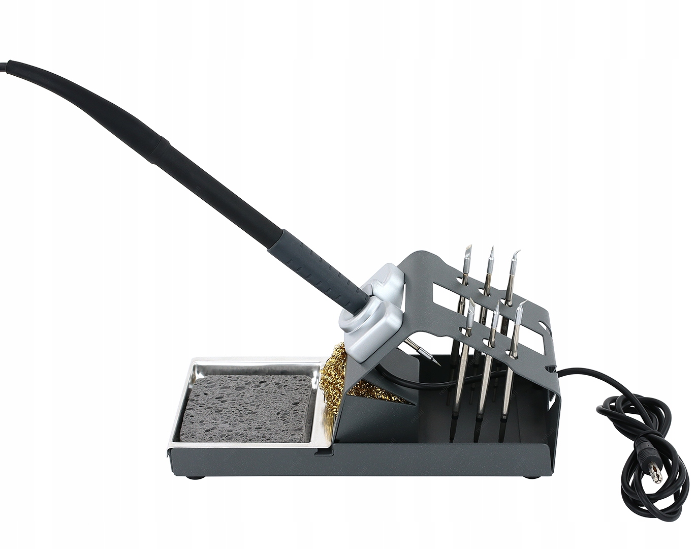 Паяльная станция, утюг, очиститель жал, губка и жала, представленные на фото, в продаваемую подставку не входят.