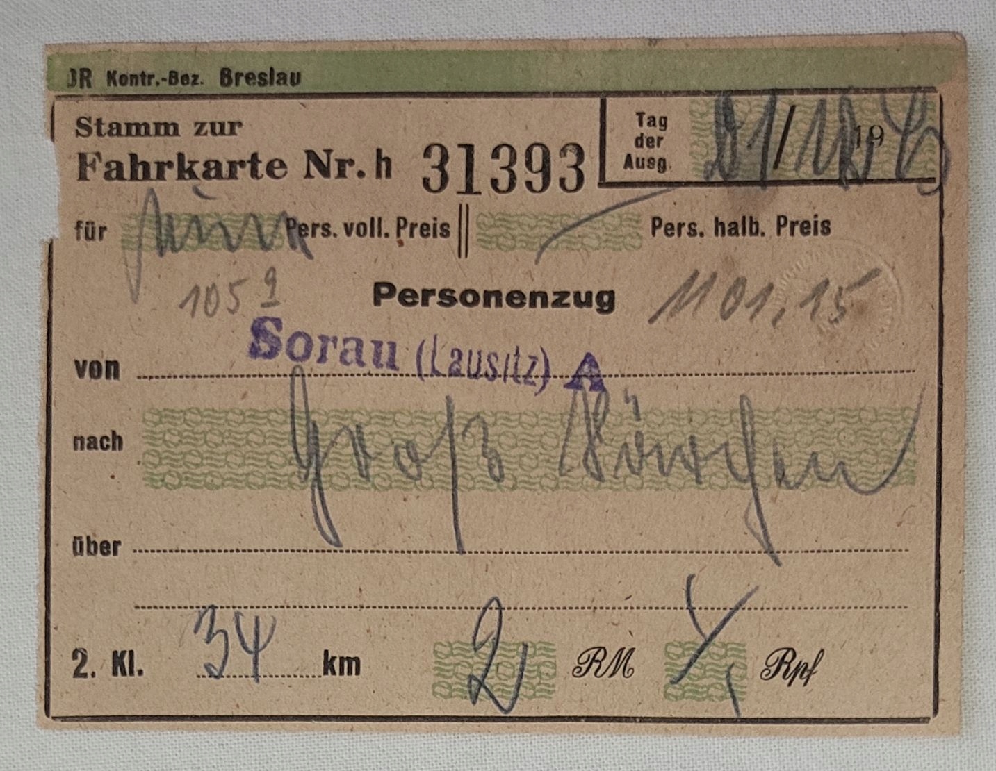 СТАРИЙ КВИТОК СОРАУ ЗАЛІЗНИЦЯ ЖАРИ ЛУСИЦЕ БРЕСЛАУ 1943 ТРЕТІЙ РЕЙХ