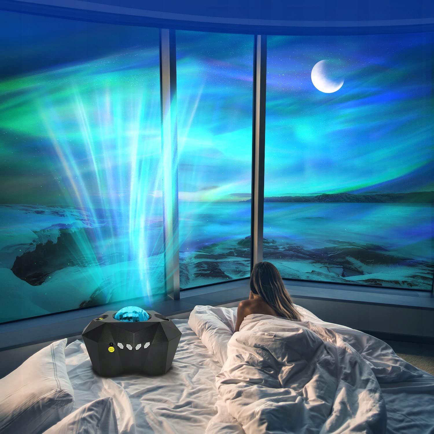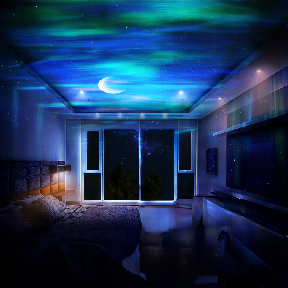 Наш проектор имеет очень уникальный и красивый эффект северного сияния и луны. Сделайте свою комнату уникальной и расслабьтеськак будто вы лежите под скандинавским небом!