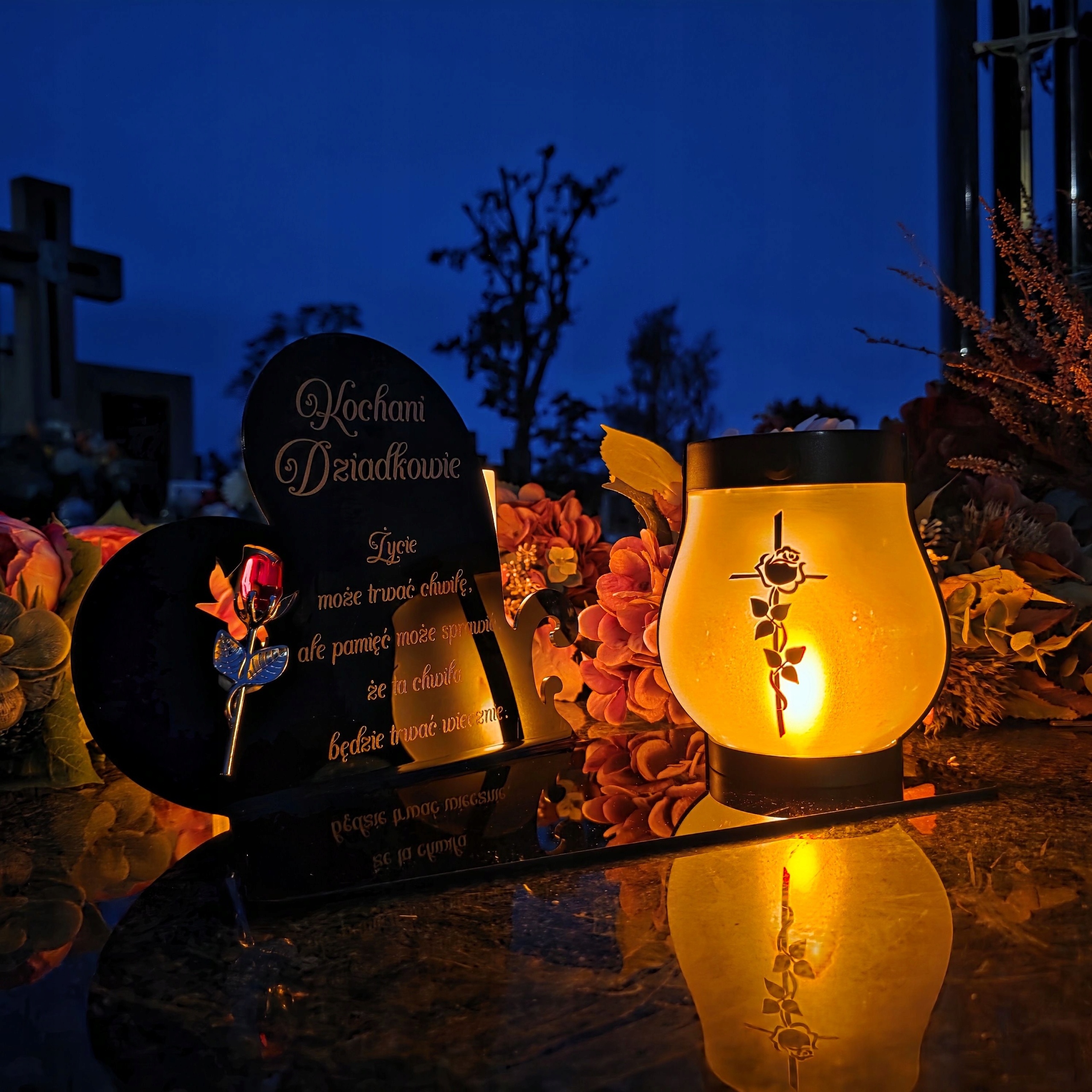 - Элегантный акцент в память о близких. Красный хрустальный цветок ❤️ на серебряной металлической ножке красиво контрастирует с черным цветом тарелки и подчеркивает гравировку 🕯️.