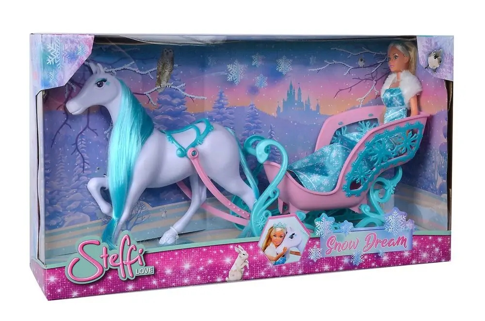 Описание товара Steffi Love Snow Dream / Сказочные сани с лошадью и Штеффи в образе ледяной принцессы / Длина: 50 см / Кукла 29 см / Подходит для детей от 3 лет. Уведомление о безопасности. Не подходит для детей младше 3 лет.
