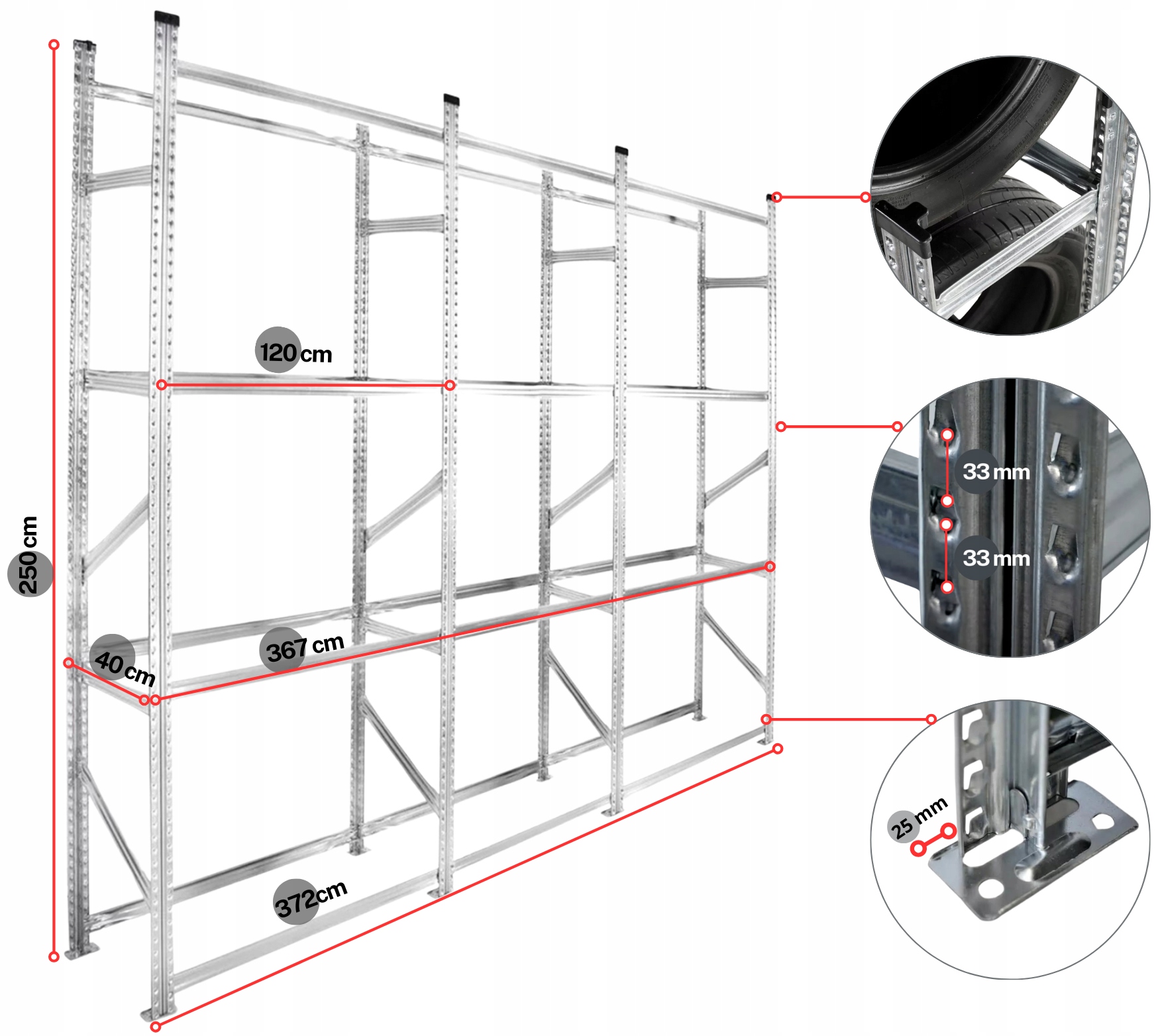 Шаг перфорации каждые 33 мм, что позволяет подогнать высоту уровней хранения под размер шин/колес, при этом максимальное расстояние между уровнями составляет 70 см.