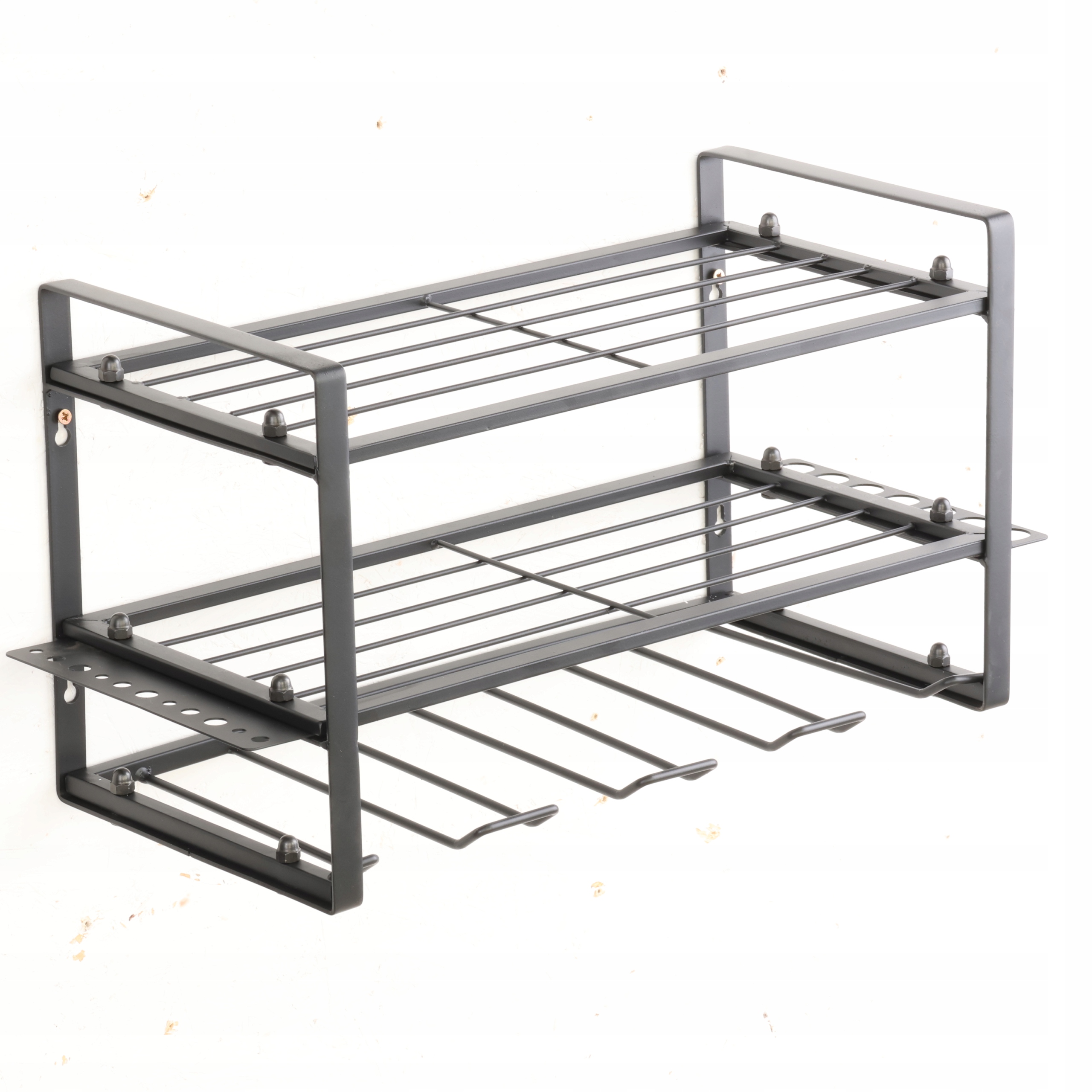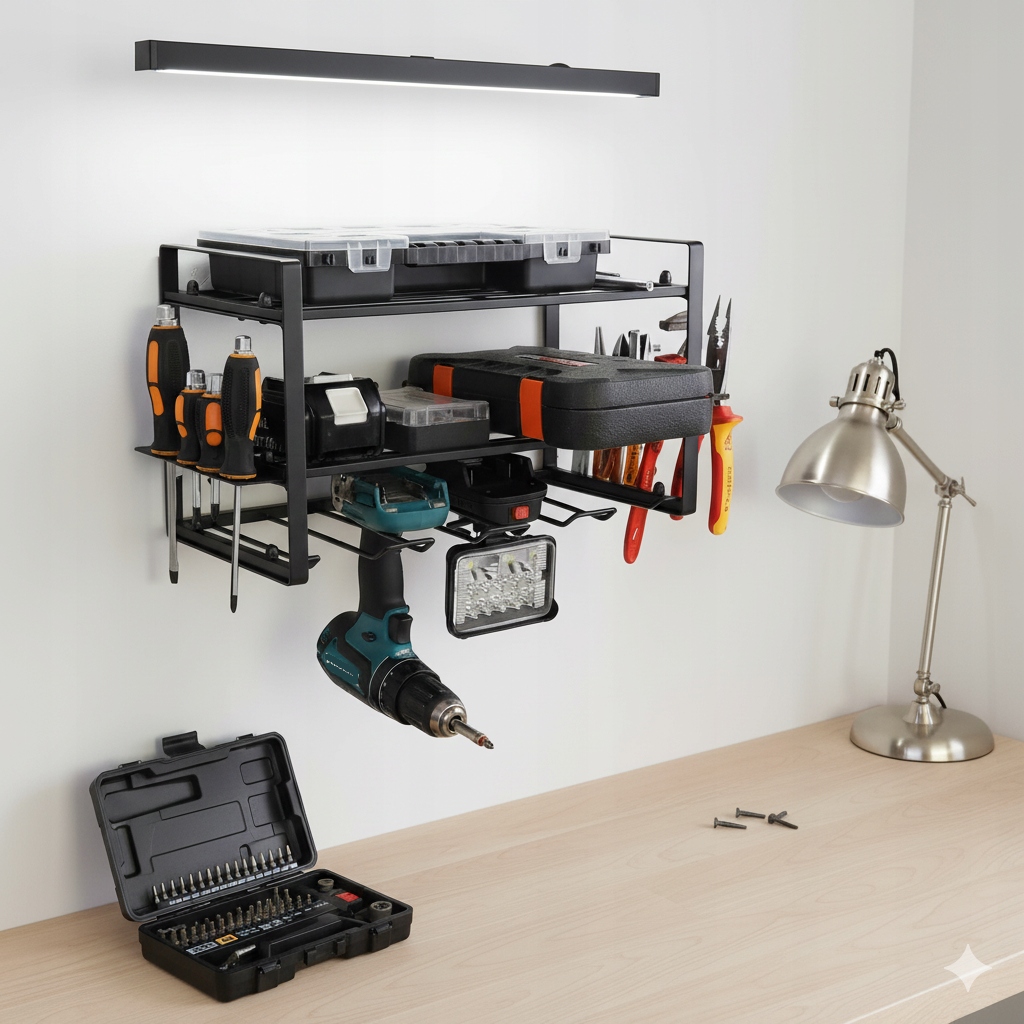 Упорядочение инструментовОдной из ключевых особенностей полки являются три практичные полки. Особого внимания заслуживает нижняя полка, ведь она была специально разработана для подвешивания инструментов. Он имеет встроенные крючки, которые позволяют удобно и безопасно хранить отвертки, ключи, молотки и другие часто используемые предметы. Благодаря этому у вас все под рукой, а инструменты не занимают ценное место на столешнице.