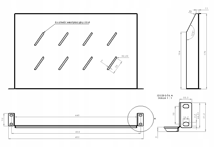 - Внешние размеры: 485 х 51,5 х 170 мм