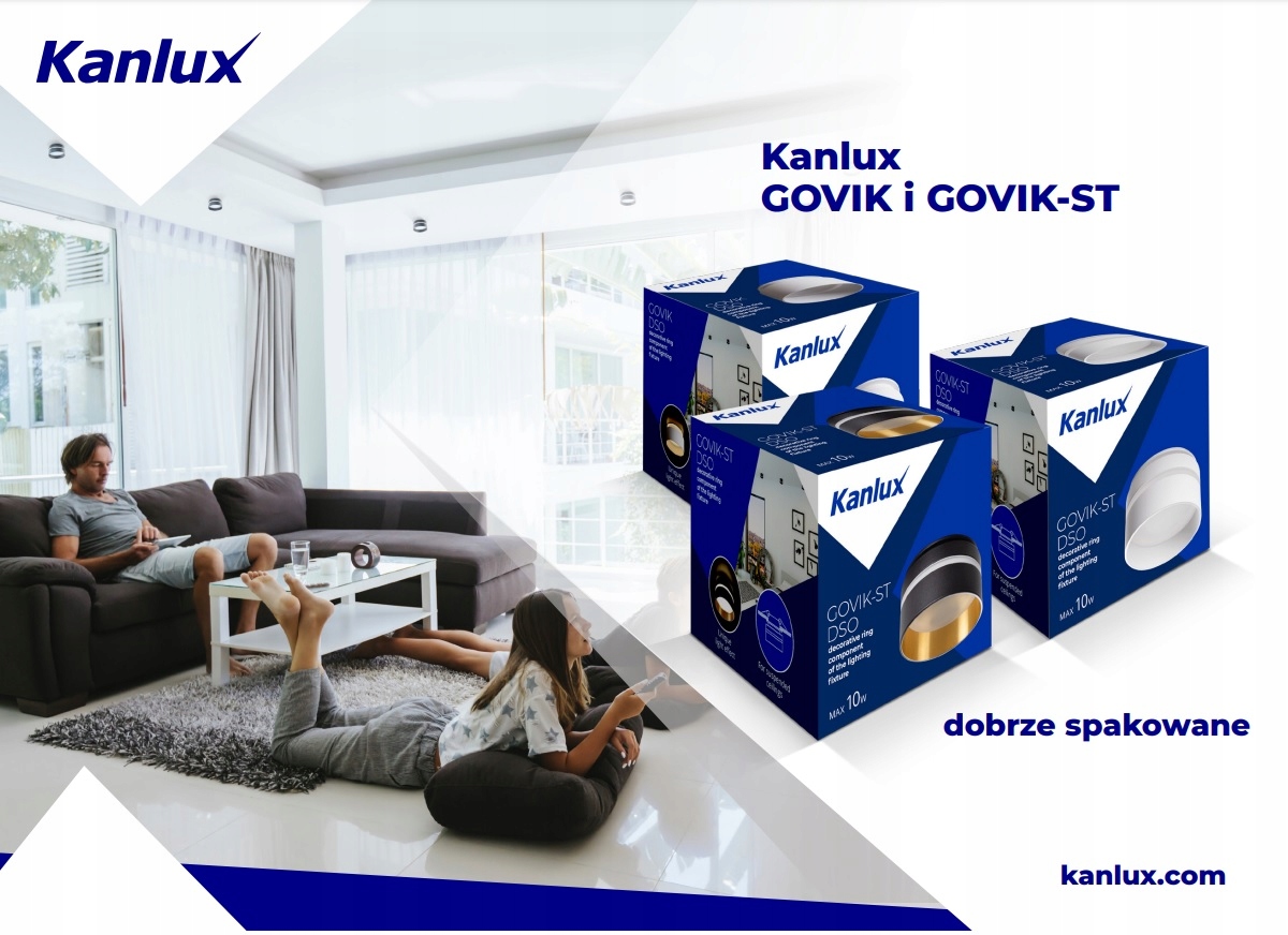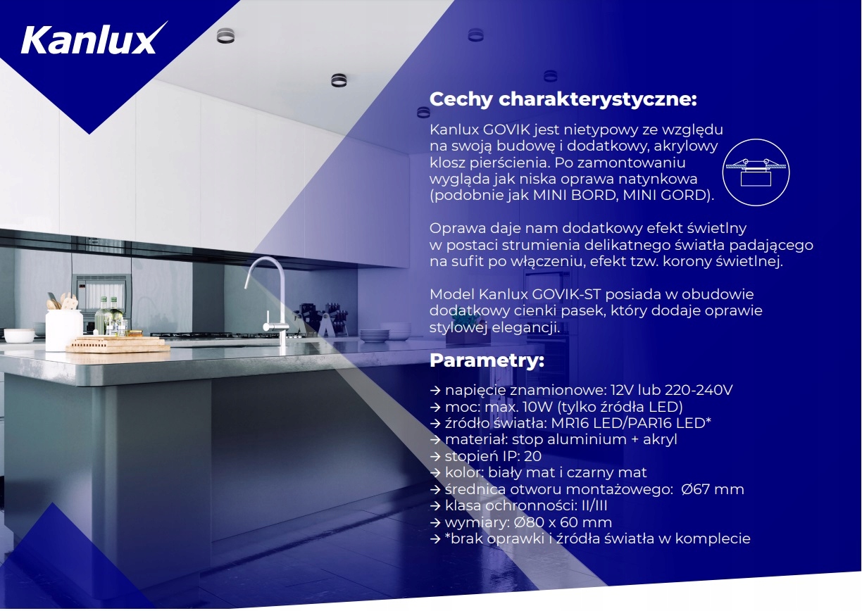 KANLUX GOVIK встраиваемый светильник с уникальным дизайном. Использование матового акрилового абажура рассеивает свет и делает невидимым установленный источник света. Благодаря своей конструкции Kanlux GOVIK выглядит как миниатюрный светильник накладного монтажа, а версия ST также имеет световое кольцо, придающее уникальный характер.