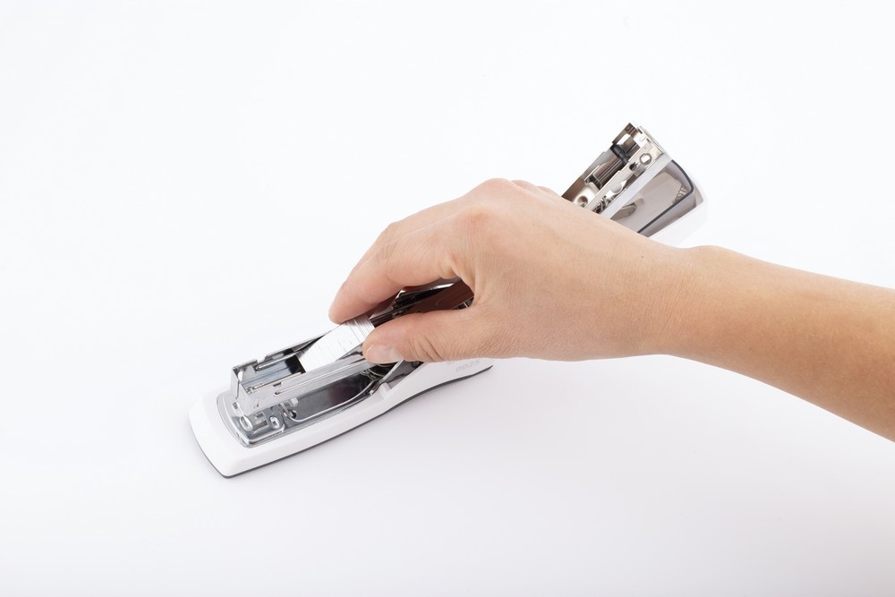 Уникальный офисный степлер с уменьшением силы сшивания до 60%, что делает сшивание больших объемов бумаги простым и приятным. Степлер изготовлен из прочного материала, внутри имеет металлический механизм.