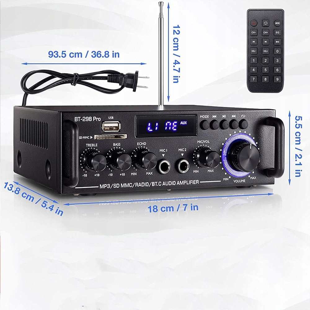 🌟🌟🌟 Звук в небольшом корпусе - этот компактный усилитель BT обеспечивает звук стерео RMS 50WX2/Max 400WX2, так что вы можете наслаждаться качеством чистого звука. Идеально подходит для караоке, домашнего кинотеатра и звуковых систем. Идеально подходит для небольших квартир, спален, офисов, подвалов и гаражей. Компактная конструкция легко подходит для полки или в шкафу AV