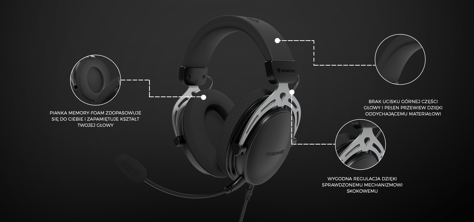 При создании GENESIS Toron 531 мы знали, что построить комплект, способный выдержать многое, непросто, но возможно. Результат кропотливой работы — гибкое оголовье, прочные направляющие системы ступенчатой регулировки и металлические крепления чашек в цвете «Gun Metal». Все это дополняется изящным логотипом GENESIS и классическим черным цветом, что делает Toron 531 идеальным не только для игр, но и для использования в офисе или во время путешествий.