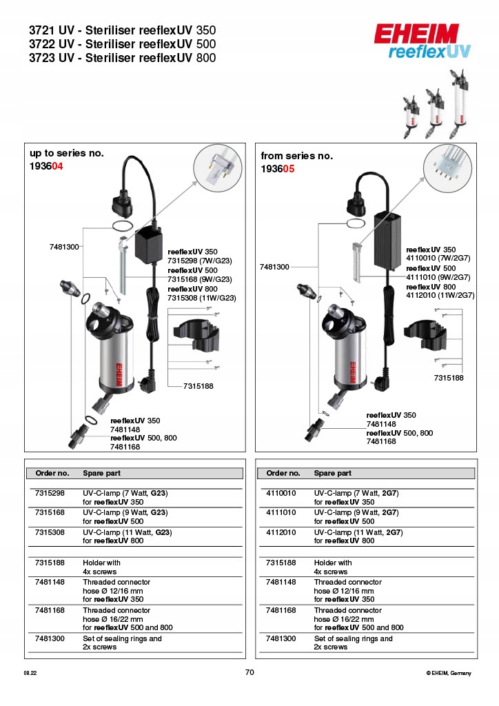 Аксессуары: лампа EHEIM UV-C, монтажный элемент, балласт с сетевым кабелем, 2 соединительных крана для шлангов ø 12/16 мм, 2 соединительных крана для шлангов ø 16/22 мм