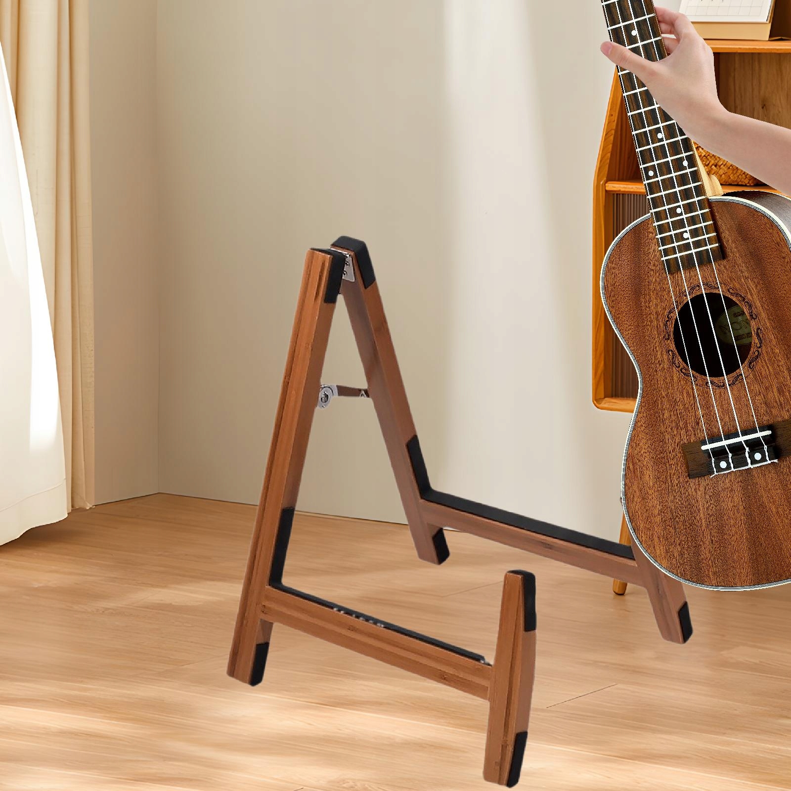 [Складная конструкция]: этот деревянный держатель для гитары легко складывается для быстрого хранения. Он экономит место и его удобно носить с собой куда угодно.