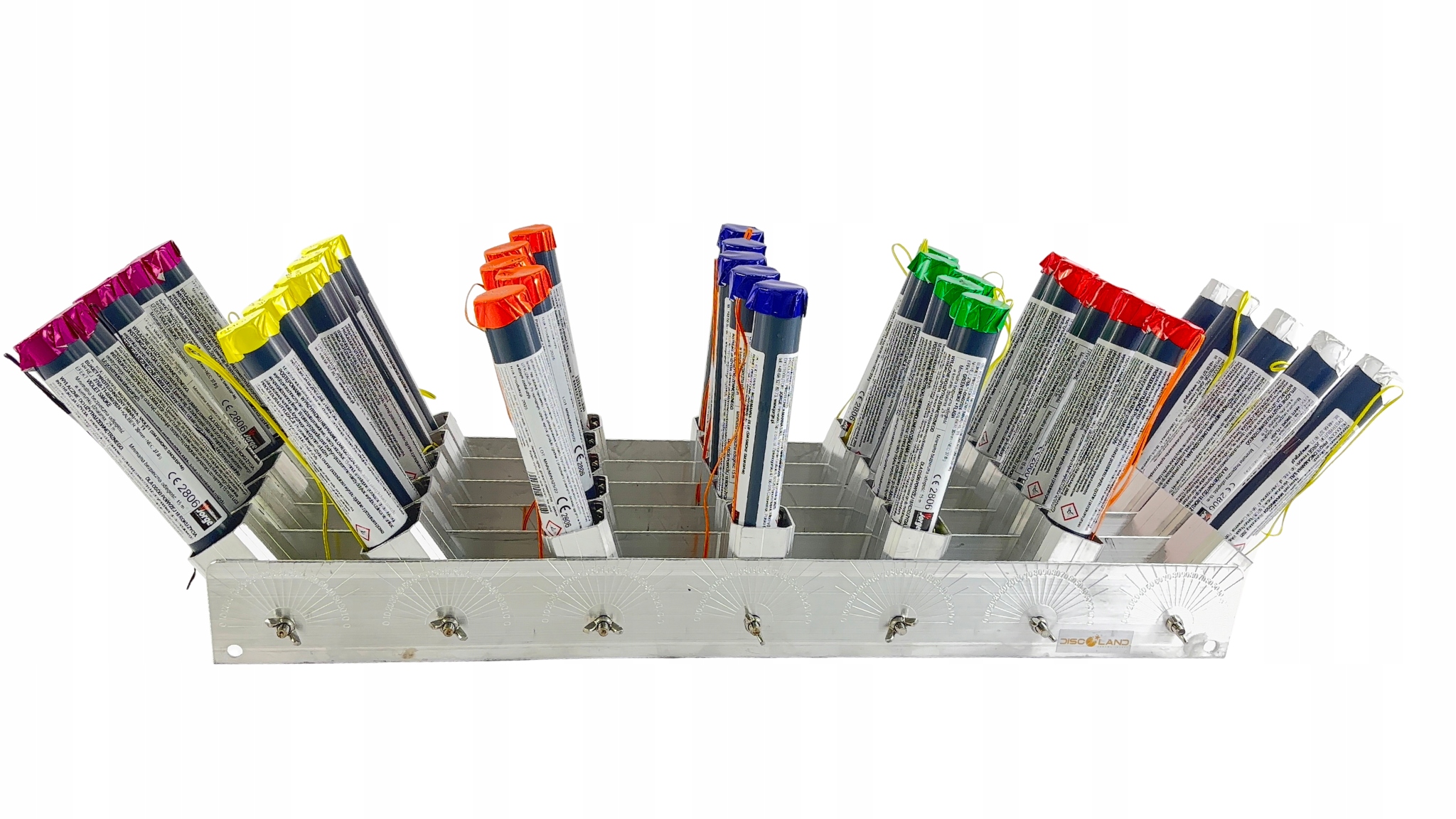 Тип изделия: Пиротехническая подставка Назначение: Дымовые мины, искровые фонтаны, эффекты одиночного выстрела Диаметр камеры: 1,2 дюйма (ок. 30 мм) Количество камер: 35 Материал: Алюминий (легкий, устойчивый к погодным условиям) Возможность регулировки угла наклона: Да (каждая камера индивидуально) Система стабилизации: Внутренний язычок, удерживающий груз по оси