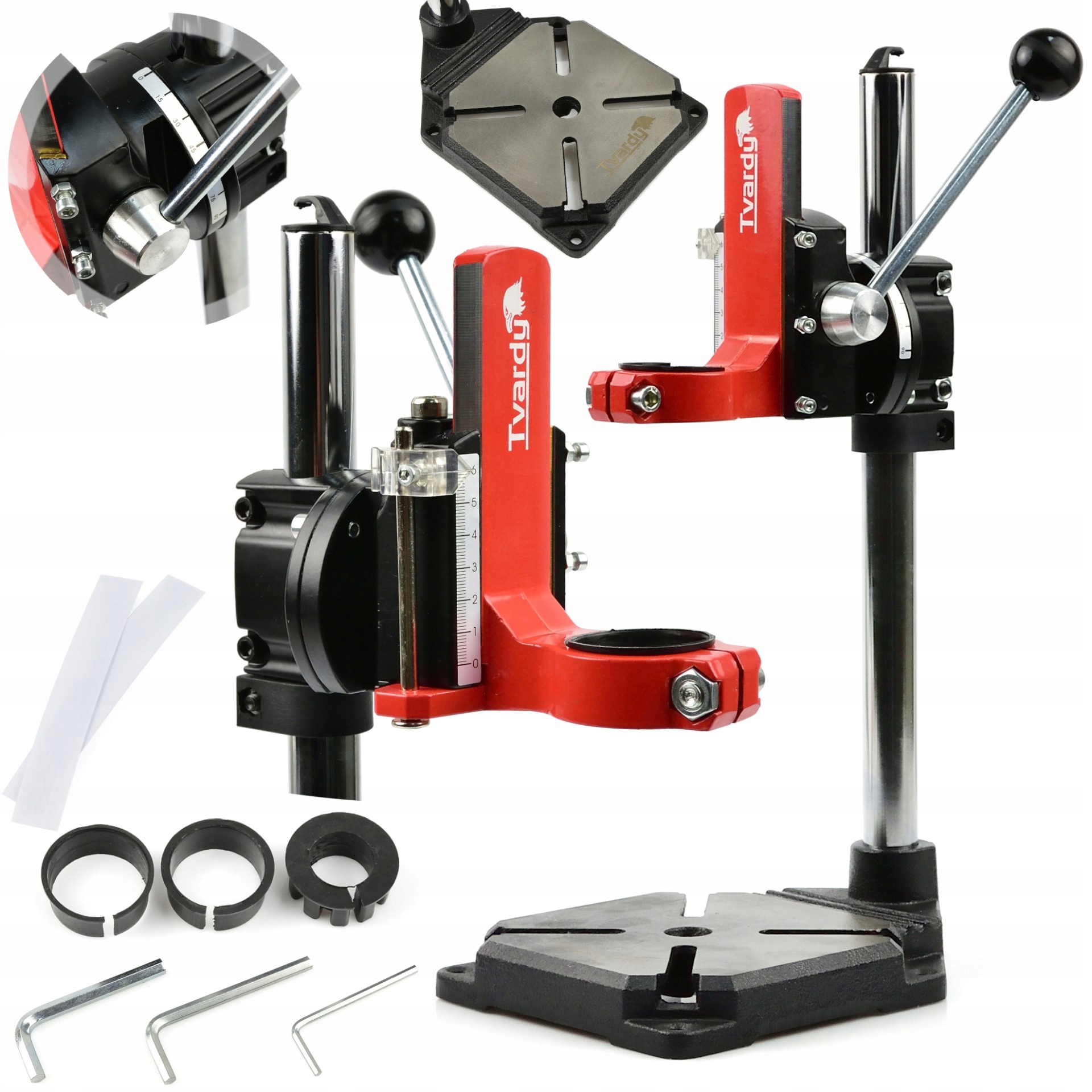 Высококачественная стойка для дрели с регулировкой вертикальной головки. Предназначен для точного сверления под углом от 0° до 90° в различных типах материалов. Возможность сверления под углом особенно полезна в столярных работах при выполнении скрытых соединений. Прочная, жесткая конструкция обеспечивает чрезвычайно высокую точность сверления. Три переходника, входящие в комплект, позволят закрепить на стойке практически любую дрель. Характеристики изделия: высокое качество изготовления, жесткая, прочная конструкция гарантирует высокую точность при сверлении, стальная тренога размерами 25 х 400 х 1,2 мм, вертикальная регулировка головки позволяет сверлить под углом 0° - 90°, максимальная сверло. ход 60 мм, основание с возможностью установки тисков, регулировка глубины сверления, в комплекте 3 адаптера, позволяющие устанавливать различные типы сверл, максимальный диаметр фланца сверла 43 мм, оснащен прочной возвратной пружиной, цельнолитой железная основа с возможностью крепления к столешнице
