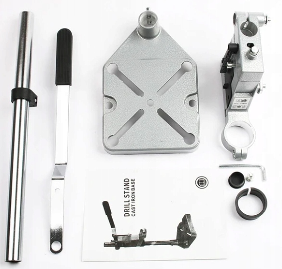 Стойка для дрели превращает дрель в многофункциональное и практичное устройство. Подставка позволяет установить дрель вертикально. Отличный прибор для точного сверления отверстий в различных материалах. Корпус изготовлен из алюминия, что делает его легким и прочным. Управление прикрепленной дрелью предполагает управление пружинным рычагом, который позволяет дрели автоматически возвращаться в исходное положение.