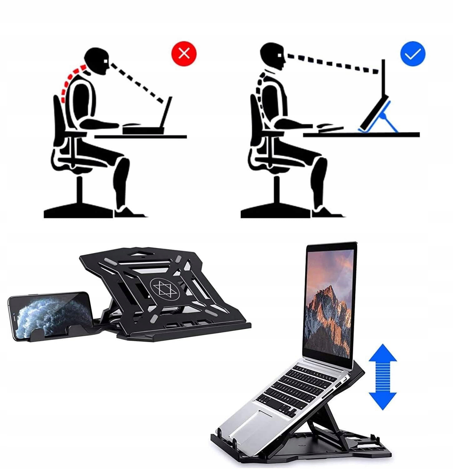 Практическая и стильная подставка для ноутбука, которая сочетает в себе функцию охлаждения, регулируемую стойку, ручку телефона и вращение 360 °. Идеально подходит для тех, кто ценит комфорт, здоровое отношение и универсальность во время работы или обучения.