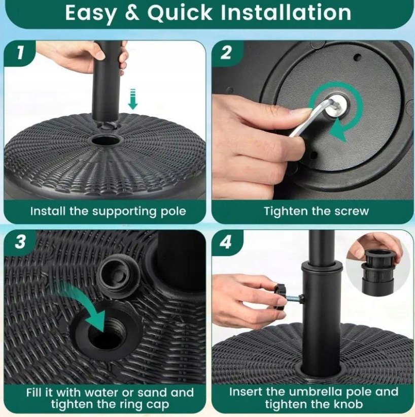 Эта загруженная основание под зонтиком легко установить, и все, что вам нужно сделать, это установить опорный столб, затянуть винт, заполнить его водой или песком и затянуть кольцевой пробку, затем положить полюс паразоля и затянуть ручку. Регулируемая ручка фиксации обеспечивает отличную стабильность. Он отлично подходит для домашнего использования в саду, во дворе, бассейне и патио, но его также можно использовать для коммерческих целей в кафе, бистах, пивных садах и ресторанах
