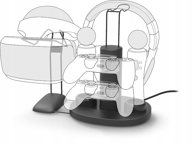 VREADY Система зарядки 4-в-1 означает компактность и поддерживает порядок в игровой комнате. Он предлагает место для двух контроллеров PS4 и двух PS Move. Зарядную станцию дополняют два практичных металлических держателя — для очков PS VR® и гарнитуры/наушников. Блок питания переменного тока обеспечивает зарядку независимо от консоли. А если у всех контроллеров закончится заряд, VREADY зарядит их в течение четырех часов.