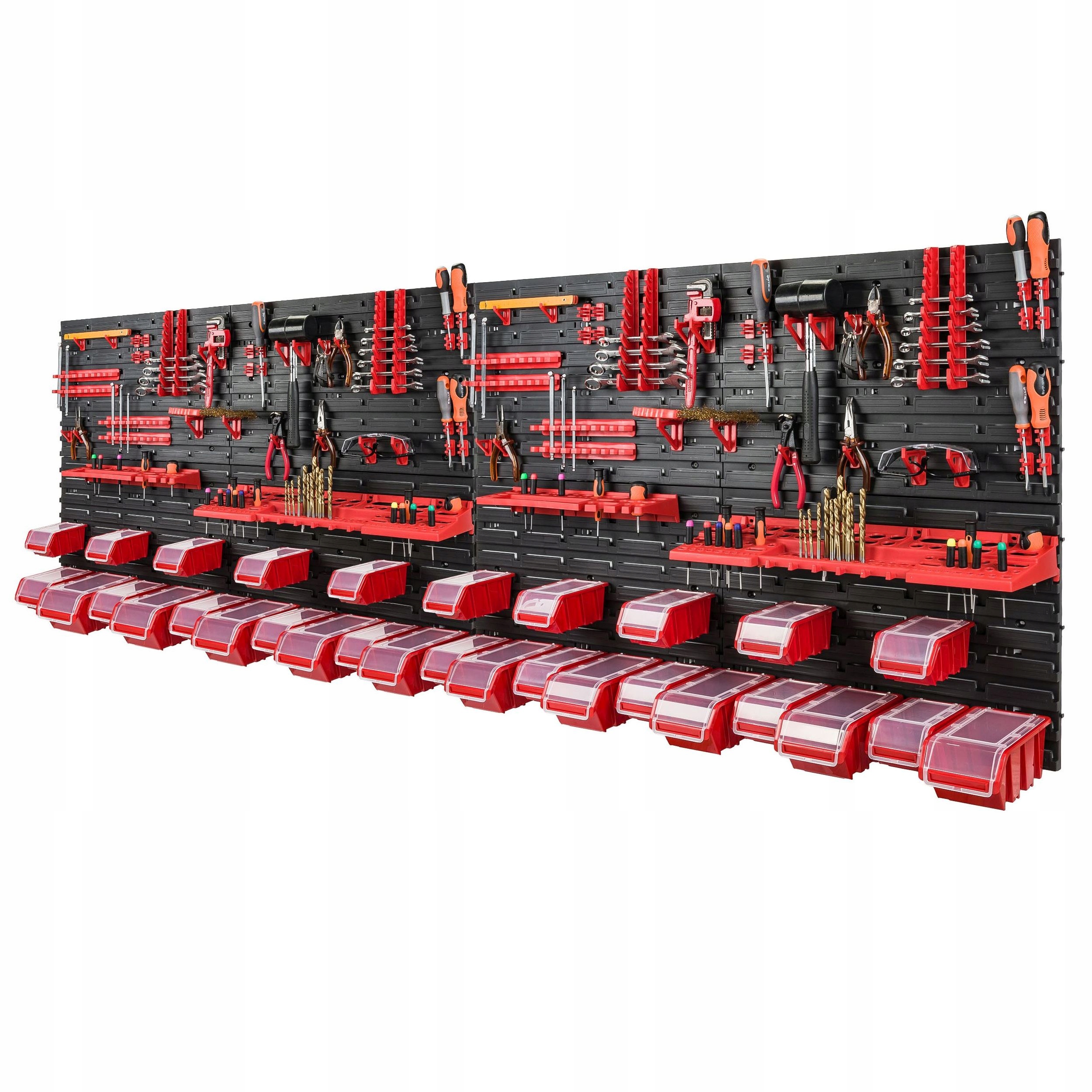 - Наборы держателей: В комплект входят: 2 полки для инструментов 580 x 158 x 67 мм, 2 полки для инструментов 384 x 111 x 50 мм, 16 держателей для ключей (8 вертикальных, 8 горизонтальный), 32 держателя для отверток, мелких инструментов, 16 подвесок 5,5 см, 16 подвесок 3,5 см.