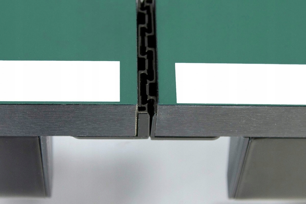 - Потянув двумя руками за металлическую рамку, расположенную под столешницей, разблокируются замки с правой и левой стороны. Два крыла столешницы перемещаются из положения хранения в положение для игры. Если мы хотим собрать стол, действуем аналогичным образом. В положении для хранения стол должен находиться в вертикальном положении, чтобы замки системы складывания могли правильно зафиксироваться. В игровом положении замки защелкиваются, обеспечивая устойчивость стола даже на неровных поверхностях.