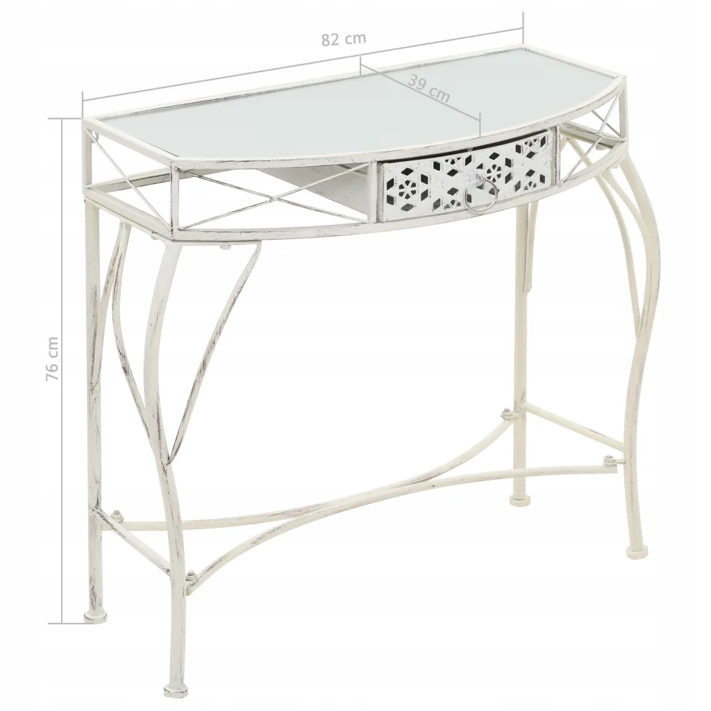 Стол, изготовленный из металлического каркаса и стеклянной столешницы, устойчив и легко чистится. Приставной столик оснащен выдвижным ящиком и украшен уникальными деталями, придающими ему старинный вид. Благодаря этому он придаст вашему дому нотку элегантности. Его легко собрать.