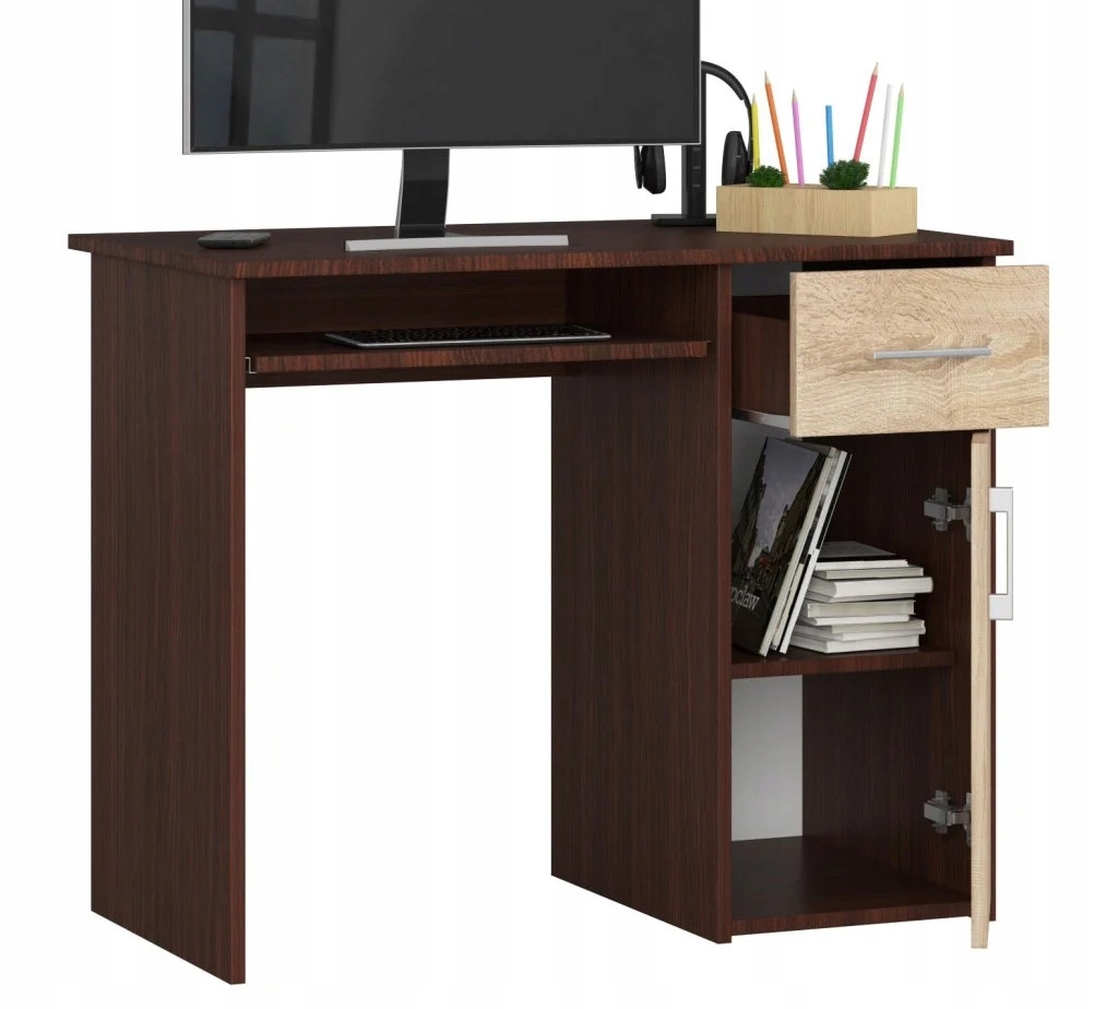 Классический, элегантный отдельно стоящий письменный стол отлично подойдет в качестве школьной парты в детской или подростковой комнате. Также это будет хорошим решением для небольших офисов, где необходимо разместить несколько рабочих станций рядом друг с другом. Столешница шириной 90 см позволяет свободно разместить на ней монитор, а клавиатуру удобно разместить на выдвижной полке внизу. Все необходимые документы и книги мы можем разместить в большом шкафу с полкой и ящиком. Каркас стола изготовлен из плиты МДФ с устойчивым к истиранию акриловым покрытием.