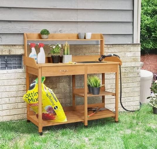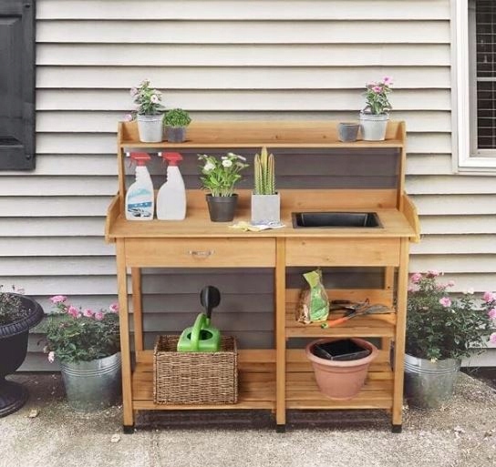 - Садовый стол с раковиной - вы можете поместить маленькие горшки на полке. Помните, что так это работает. В ящике с инструментами и нижними полками для горшков или горшечной почвы.