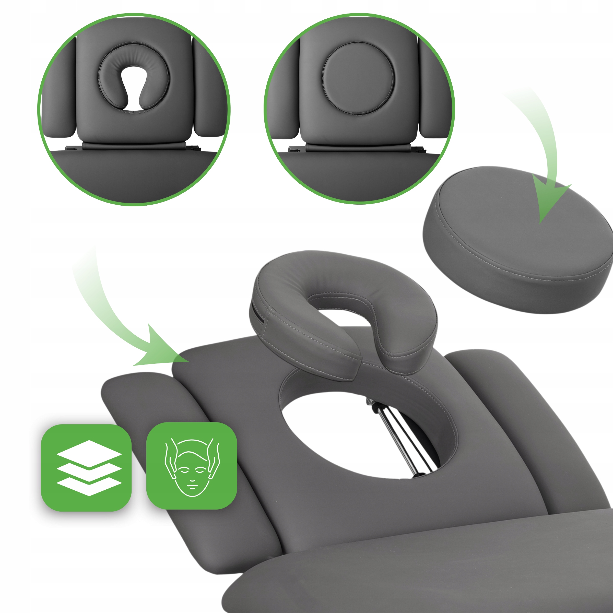 Диапазон регулировки пневматической пружины от -60° до +40° позволяет точно настроить положение головы под каждый метод лечения. Пациент сохраняет естественное, удобное положение, лежа на животе и спине, а подушка ERGO обеспечивает комфорт даже во время длительных терапевтических сеансов.