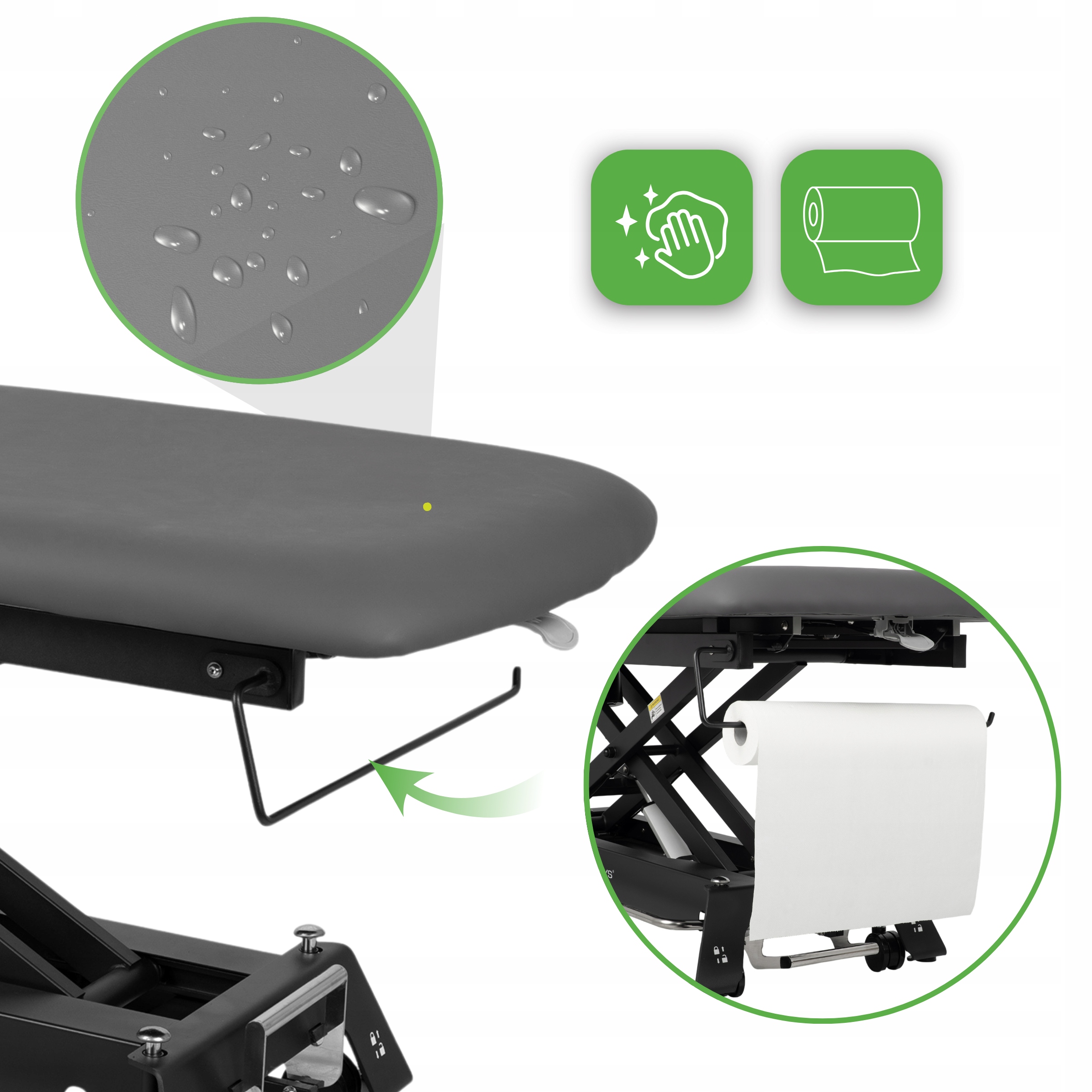 Практическая ручка позволяет быстро и удобно развернуть прокладку, поэтому подготовка стола к следующей процедуре занимает считанные минуты. Он подходит для роликов шириной до 60 см и повышает гигиеничность работы, позволяя поддерживать чистоту столешницы, не прерывая терапию.