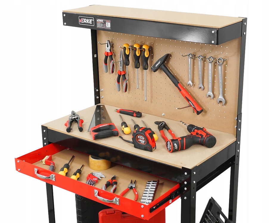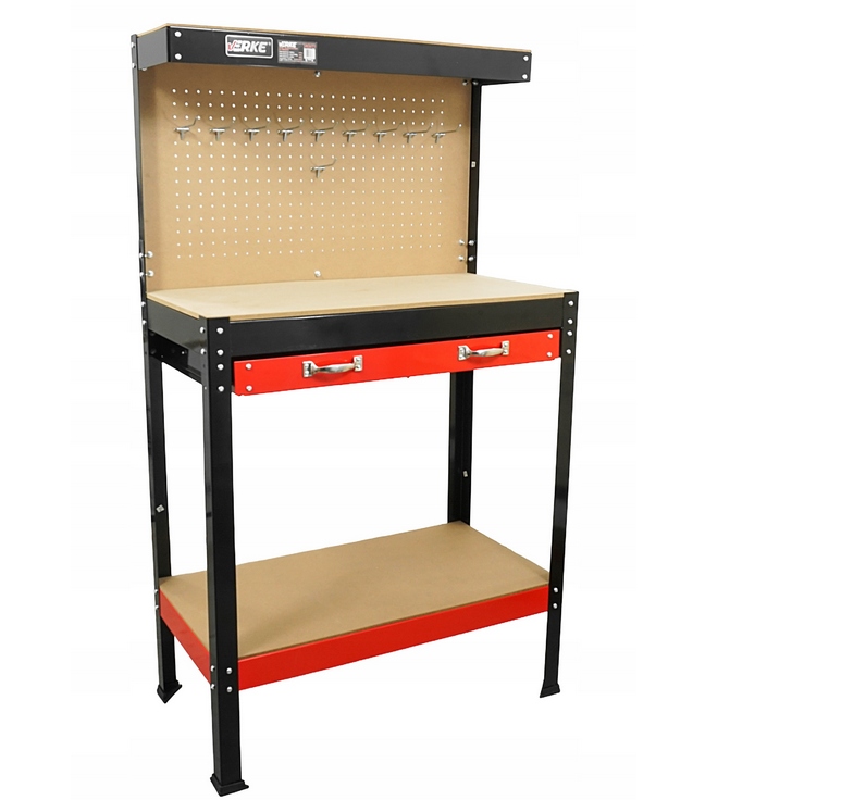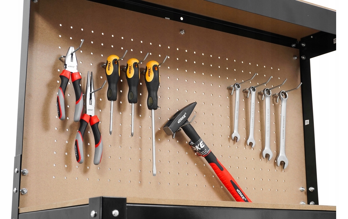 Нижняя и верхняя полка и дополнительная перфорированная плата инструментов с 10 крючками позволяют любые расположение и обслуживание заказа в мастерской. Максимальная нагрузка доски составляет 20 кг.