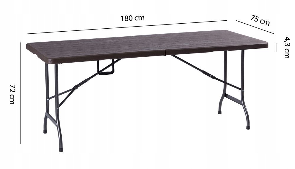 Столешница изготовлена из прочного полиэтилена, с рисунком, имитирующим деревянные доски. Стол полностью устойчив к внешним погодным условиям. Все это поддерживается прочной стальной рамой толщиной 25 мм с порошковым покрытием. Банкетный стол имеет фиксатор, предотвращающий самопроизвольное и неконтролируемое складывание. Весь стол можно сложить пополам в удобный чемодан с ручкой. Максимально допустимая нагрузка — 100 кг.
