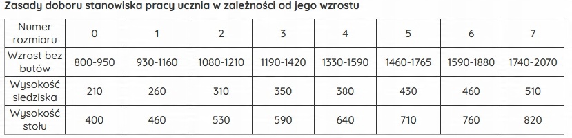 Размеры в соответствии с правилами выбора рабочего места ученика и стандарт: