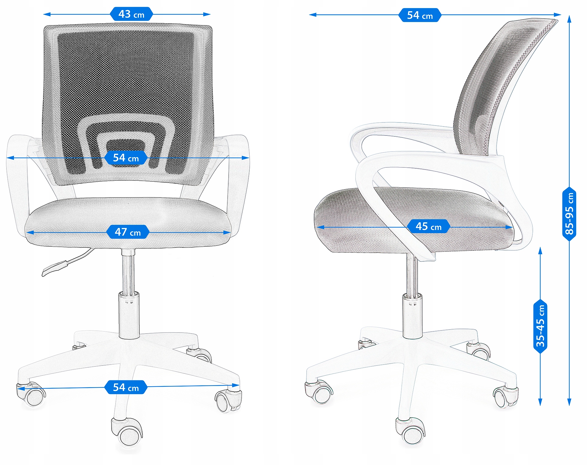 Максимальная высота сиденья: 45 см. Минимальная высота сиденья: 35 см. Ширина сиденья: 47 см Глубина сиденья: 41 см