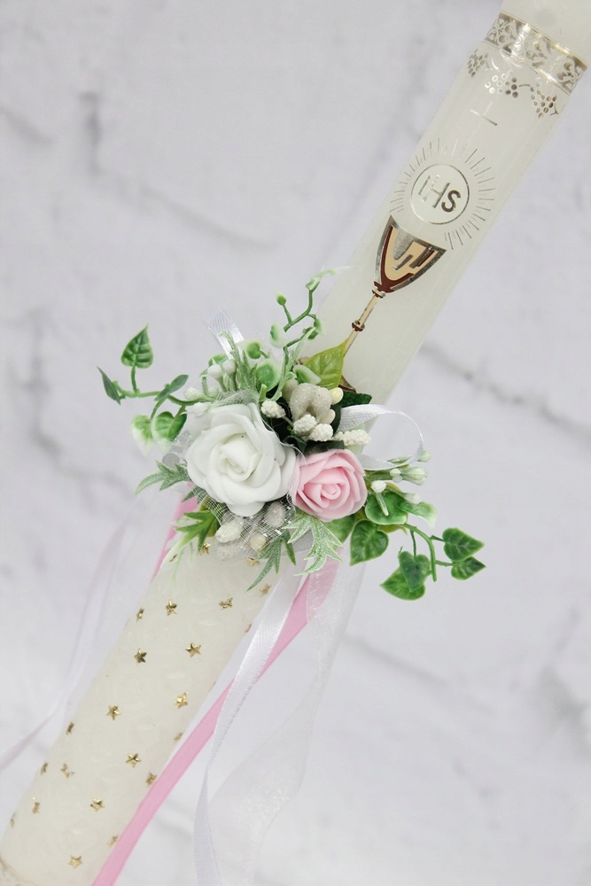 Красивое украшение для свечи для причастия или крещения, наполненное цветами роз, украшенное листьями плюща и другими стильными аксессуарами.