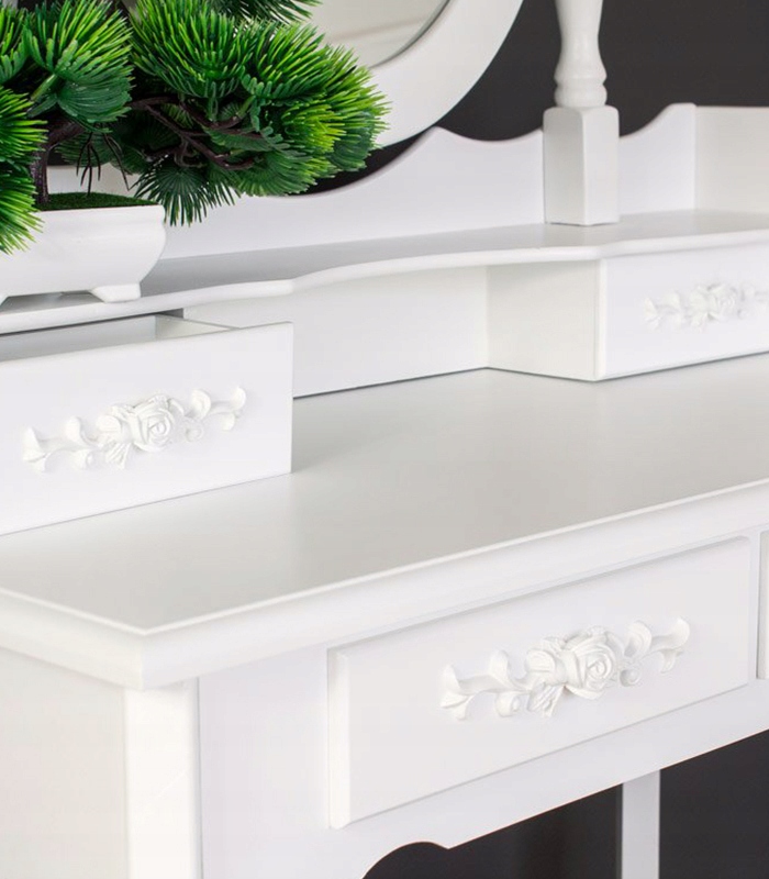 Наш туалетный столик станет прекрасным дополнением спальни каждой женщины. Элегантный стиль сделает его идеальным компаньоном как для взрослых, так и для молодых женщин, интересующихся макияжем. Туалетный столик очень функционален и позволяет разместить множество косметических и косметических аксессуаров как на столешнице, так и в ящиках. Большое вращающееся зеркало будет полезно в повседневном использовании. Вы можете корректировать объект независимо от угла падения света, чтобы получить лучшее поле зрения. В комплект входит стильный табурет, который обеспечит комфорт во время ухода за собой или нанесения макияжа.