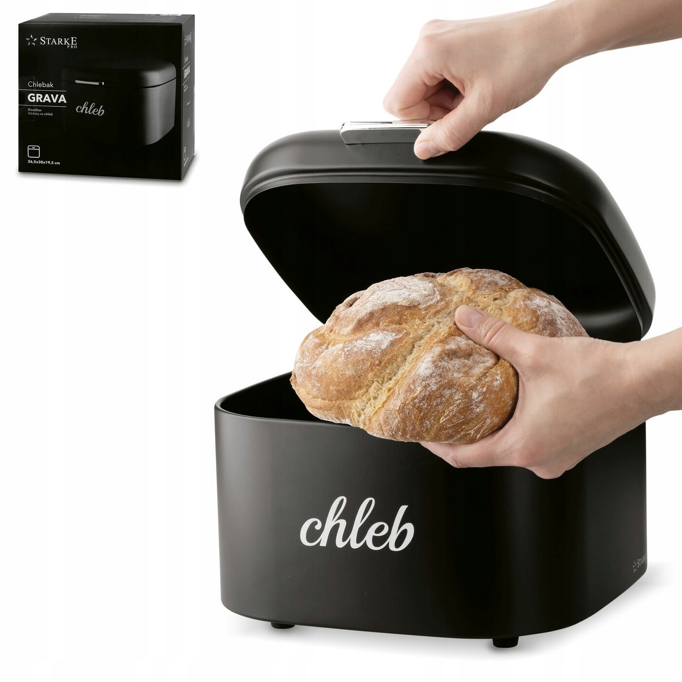 Черная хлебница Starke Pro Grava 26,5 х 30 х 19,5 см изготовлена из углеродистой стали. Модель имеет шарнирную застежку. Крышка хорошо защищает содержимое от грязи и света. Он также обеспечивает бесплатный доступ к контенту. Продукт имеет приятный матовый финиш. Польская надпись «хлеб» и блестящая ручка добавляют элегантности. Здесь можно разместить хлеб и булочки для всей семьи. Это предложение для тех, кто ценит свежесть, хрусткость и аромат свежего хлеба и ищет прочную хлебницу. Вы можете устойчиво разместить его на кухонной стойке. Он не поцарапает свою поверхность, поскольку имеет 4 ножки, которые уменьшают скольжение. В составе коллекции Grava он позволит создать целостный комплект кухонного оборудования.