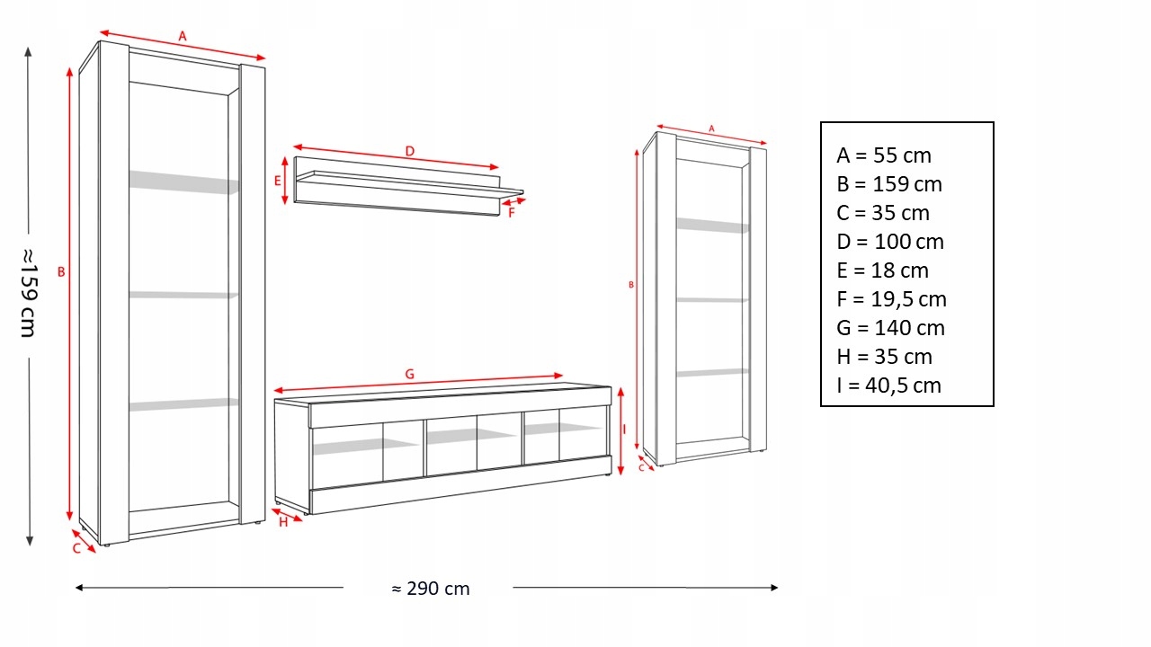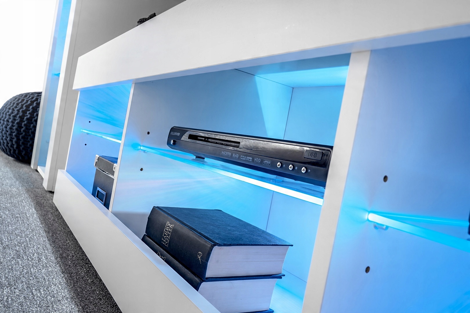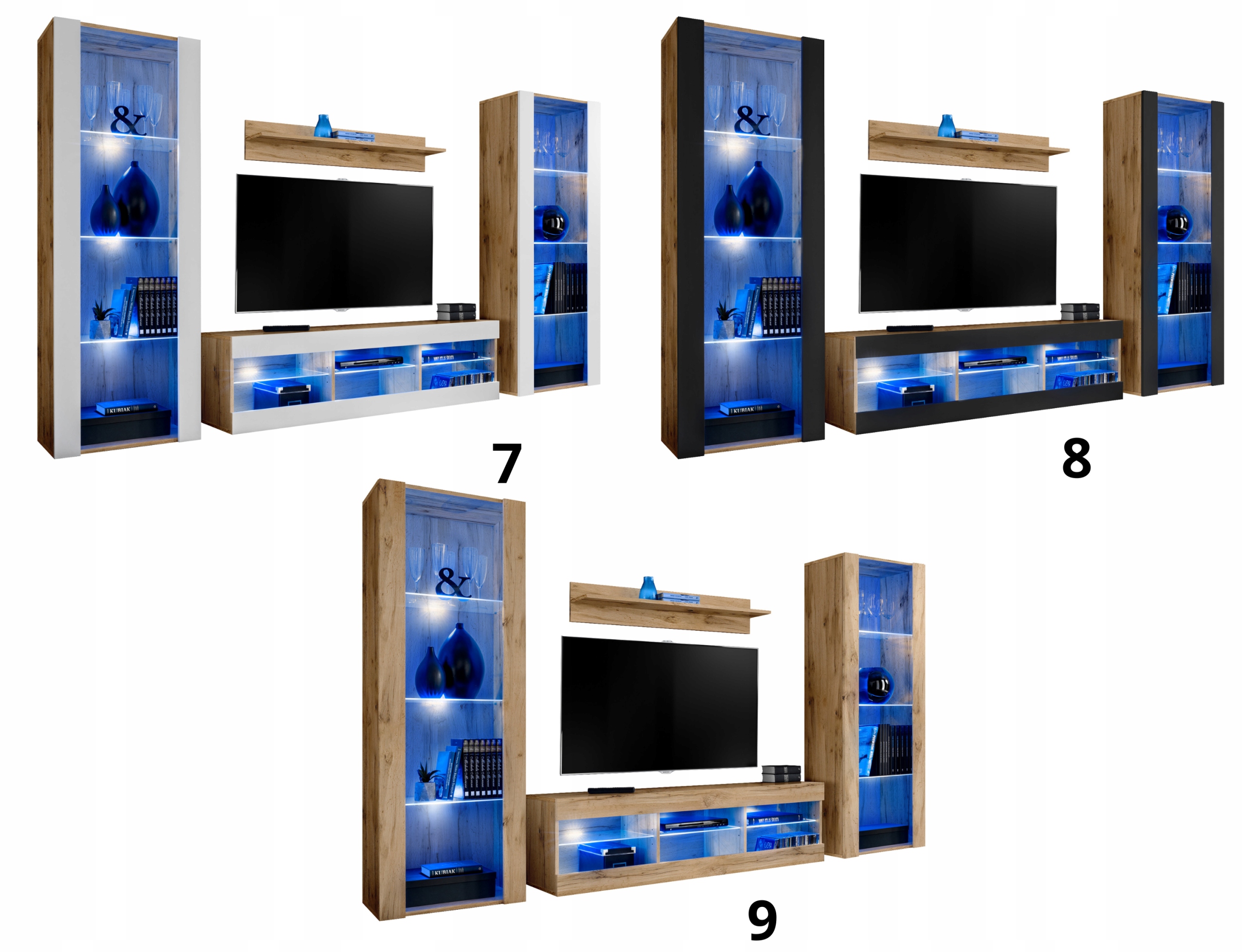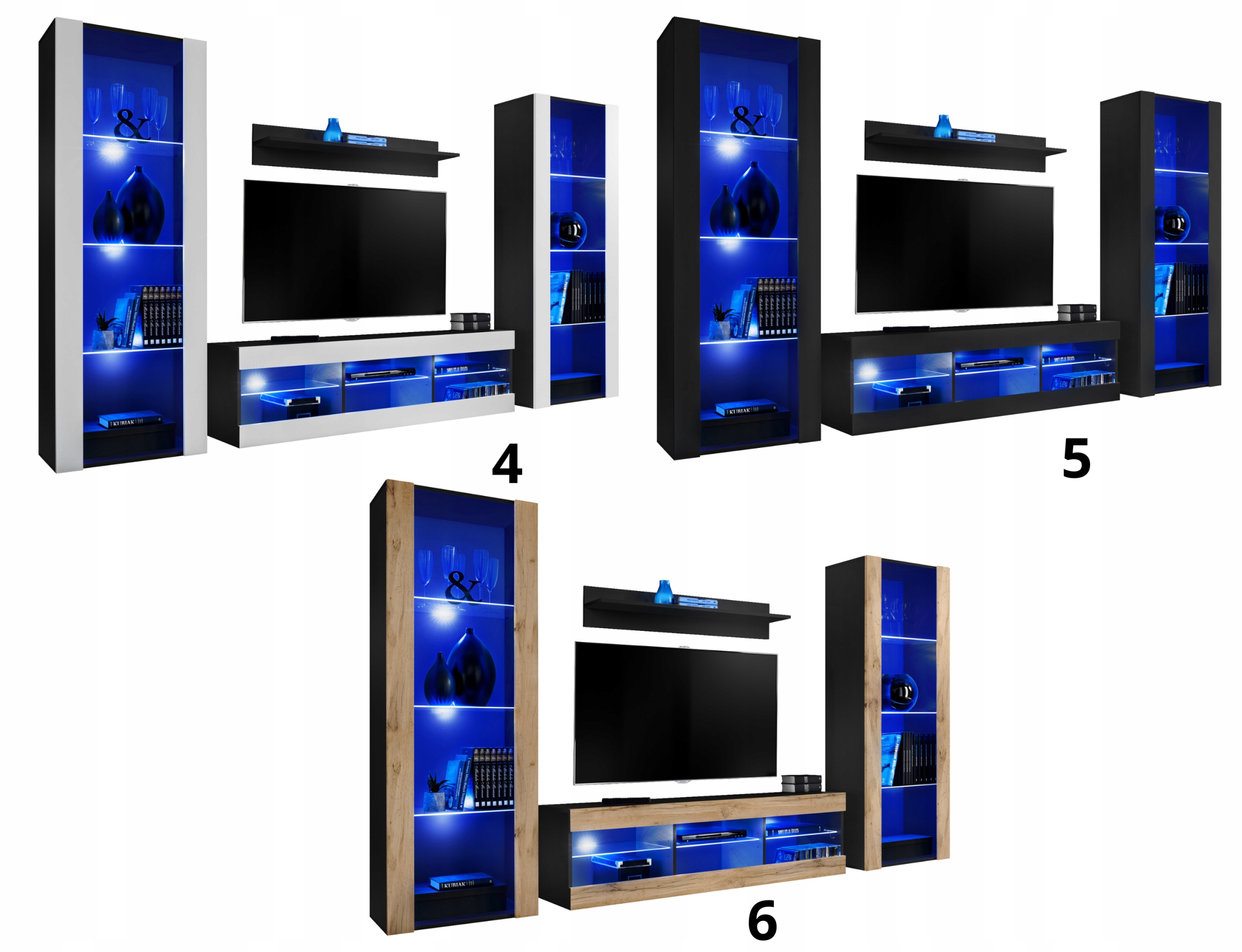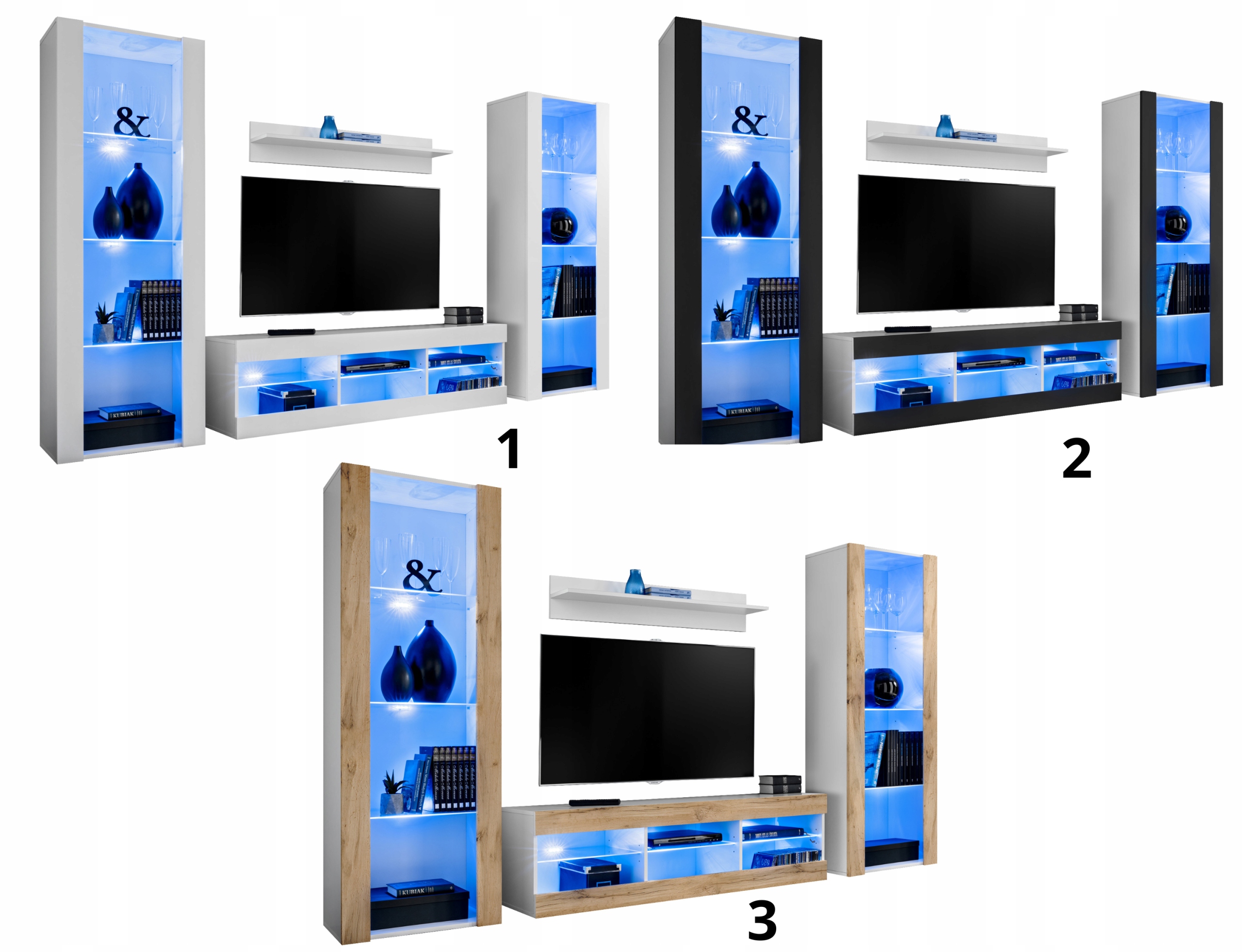 Мебель изготовлена из ламинированного картона 16 мм. Полки в витрине стеклянные. В зависимости от варианта в комплект может входить также LED освещение.