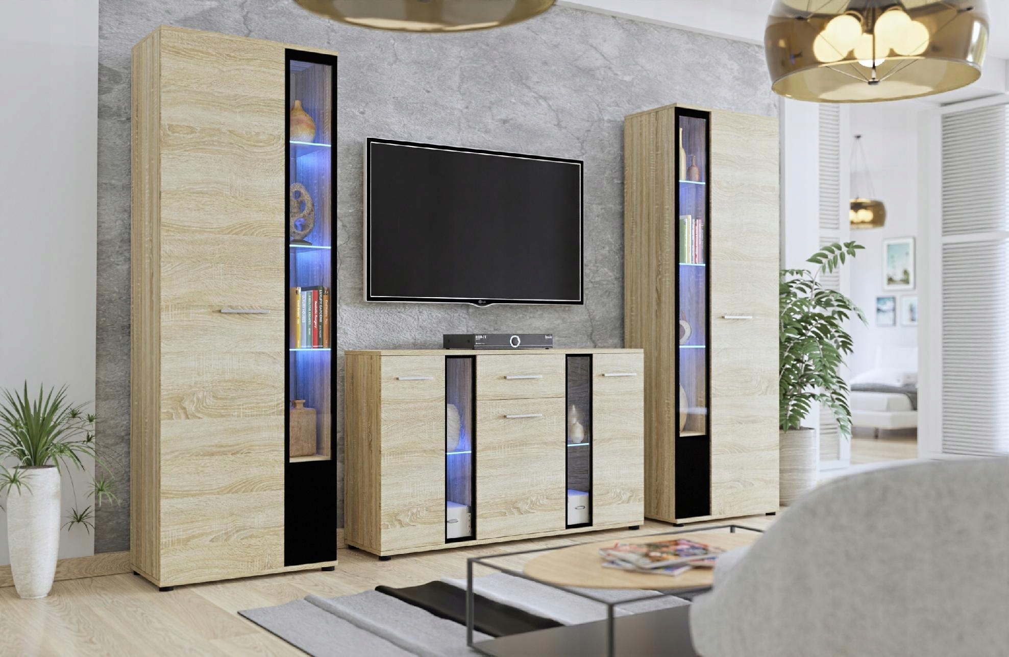 Современный настенный блок, состоящий из двух высоких участков и комод шириной 140 см с ящиком. Один из участков оснащен стержней для вешалок и полков с возможностью подсветки, а другая на четырех полках, сделанных из сопоставки и стеклянных полков, которые также можно выделить светодиодным освещением. Набор идеально сочетается с каждым из интерьеров гостиной. Мебель изготовлена из двойной двойной пластины толщиной 16 мм, характеризующейся высоким сопротивлением механическим повреждениям.