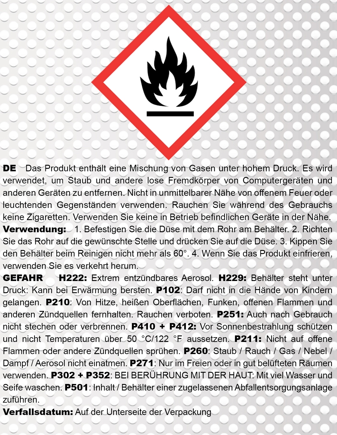 Продукт представляет собой смесь газов под высоким давлением. Используется для удаления пыли и других рыхлых загрязнений с компьютерной техники, электроники, бытовой техники и других устройств. Не встряхивайте контейнер непосредственно перед использованием.