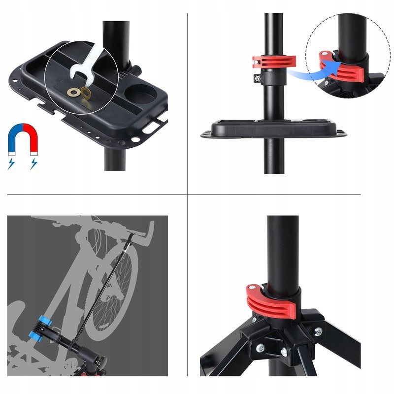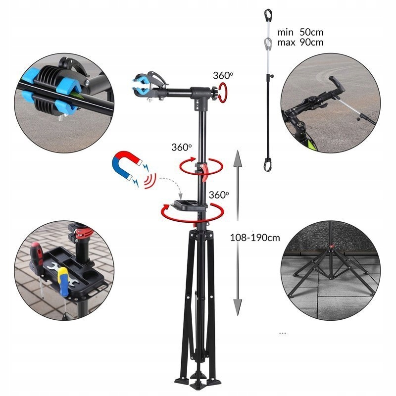 Пластиковые элементы изготовлены из качественного, ударопрочного АБС-пластика. Монтажная подставка проста и быстра, что позволяет точно выровнять велосипед и облегчает работу. Все движущиеся части оснащены быстросъемными креплениями или крепятся к основному рычагу с помощью большой барашковой гайки. Установка держателя подставки возможна между седлом и рулем, а также между стойкой крепления и рулем или передним колесом. Отрегулируйте расстояние велосипеда от подставки с помощью эластичного ремня, удерживающего руль или переднее колесо, в диапазоне от 50 до 90 см. Во время работы телескопическая стойка, регулируемая в диапазоне от 108 до 190 см, удерживает спортивный инвентарь в подвешенном состоянии, рама крепится регулируемым зажимом. Таким образом, ремонт можно выполнять на уровне глаз, а удобное рабочее положение защищает спину и колени. Устойчивость конструкции гарантируется широким раздвижением ножек. Небольшое пространство не является проблемой: ножки основания не нужно раздвигать максимум на 144 см. Примечание. Защита от опрокидывания максимальна при максимальной ширине. Подвижные ножки компенсируют небольшие неровности, но следите за тем, чтобы подставка была прямой. MZH190 оснащен магнитным лотком для инструментов, поэтому вы не потеряете винты и гайки во время работы. На велосипедах с толщиной рамы более 60 мм захват можно легко увеличить снизу с помощью винта с накатанной головкой. Большой захват со съемными нескользящими резиновыми накладками имеет ход 30 мм. Внимание! Каркас следует тщательно очистить, иначе могут появиться царапины от трения камней, песка и т. д. о ручку.